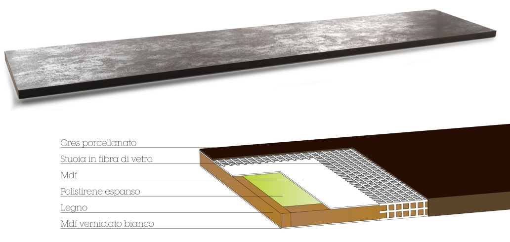 Materiale: gres porcellanato sinterizzato a 1200-1400 gradi con spessore 3mm saldato tramite speciali resine su uno speciale pannello sandwich leggero in legno, rinforzato strutturalmente con una stuoia in fibra di vetro interposta tra la lastra in gres e il pannello stesso. Profilo: spessore 4 cm con doppio smusso inferiore e superiore di 3mm. Dimensioni: 303 cm – 150 cm. Profondità: 60 cm. Supporto: pannello sandwich composto da due strati di MDF con telaio in legno e un’anima centrale in polistirene espanso ad alta densità. Finitura inferiore: MDF verniciato bianco. Imballo: in scatole di cartone protetto da polistirolo. Etichettatura: per singolo top con codice EAN. Tavoli |
