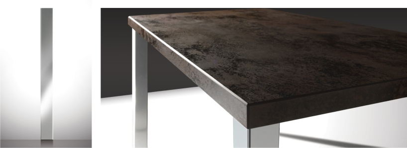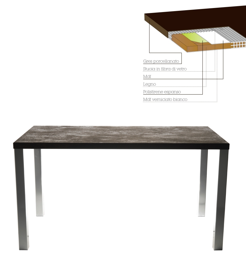 Materiale: gres porcellanato sinterizzato a 1200-1400 gradi con spessore 3mm saldato tramite speciali resine su uno speciale pannello sandwich leggero in legno, rinforzato strutturalmente con una stuoia in fibra di vetro interposta tra la lastra in gres e il pannello stesso. Profilo: spessore 4 cm con doppio smusso inferiore e superiore di 3mm. Dimensioni: 140x80 cm – 90x90 cm. Altezza: 74cm (+/- 1cm) comprensivo di piano. Supporto: pannello sandwich composto da due strati di MDF con telaio in legno e un’anima centrale in polistirene espanso ad alta densità. Finitura inferiore: MDF verniciato bianco. |