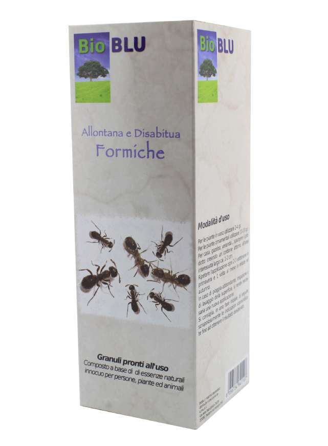 Per allontanare le formiche, sia all'interno che all'esterno, propone un prodotto in granuli pronti all'uso alle essenze naturali attive. Si tratta di una miscela di oli naturali che creano un'efficace barriera contro la presenza delle formiche, assoutamente priva di veleni. Bioblu è quindi ideale per le abitazioni in cui sono presenti bambini o animali da compagnia perchè evita ogni rischio di intossicazione.