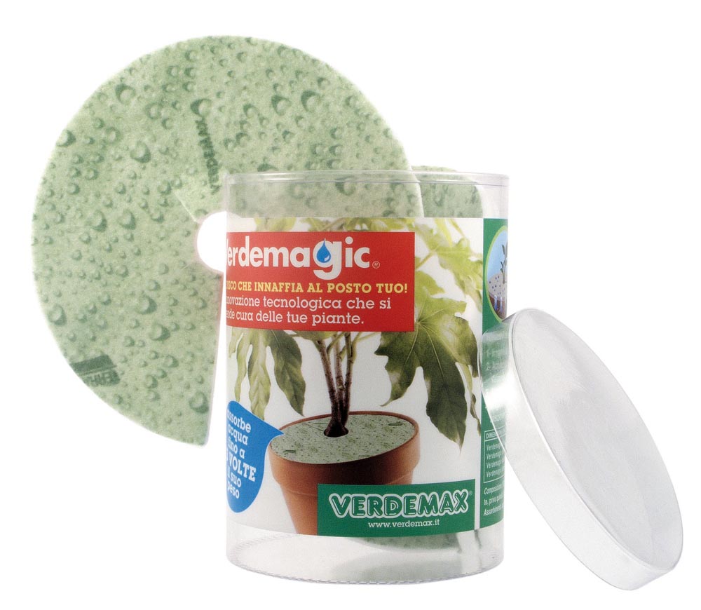 Dall’esperienza dei laboratori di ricerca Lenzi Tecnologie per il settore del florovivaismo professionale nasce Verdemagic, un disco in Terralenx, una fibra ultra assorbente che cura, protegge e mantiene le piante, rilasciando l’acqua in modo graduale. Verdemagic trattiene quantità incredibili di acqua (fino a 13 volte il suo peso), esaurendosi solo dopo molti giorni, garantendo l’irrigazione costante delle piante e della terra durante la nostra assenza.