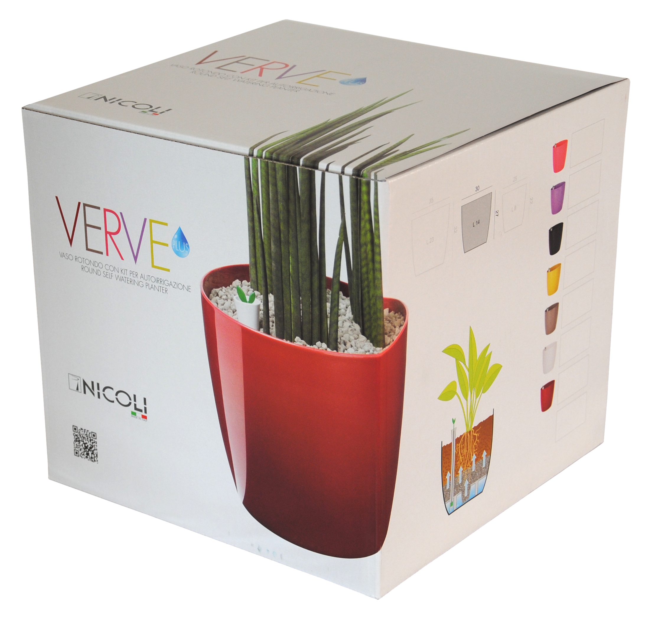 Il payoff di Nicoli “vai in vacanza tranquillo” con il nostro sistema Verve Plus, rispecchia i vantaggi del sistema di auto-irrigazione. Verve Plus è un kit in scatola completo di vaso con riserva acqua e argilla espansa, disponibile in tre misure (diametro 25cm, 30 cm e 35cm) quindi adatto a piante di medie dimensioni. Inoltre, i vasi in misura 30 e 35 cm sono dotati di 4 rulli in modo da facilitarne lo spostamento.