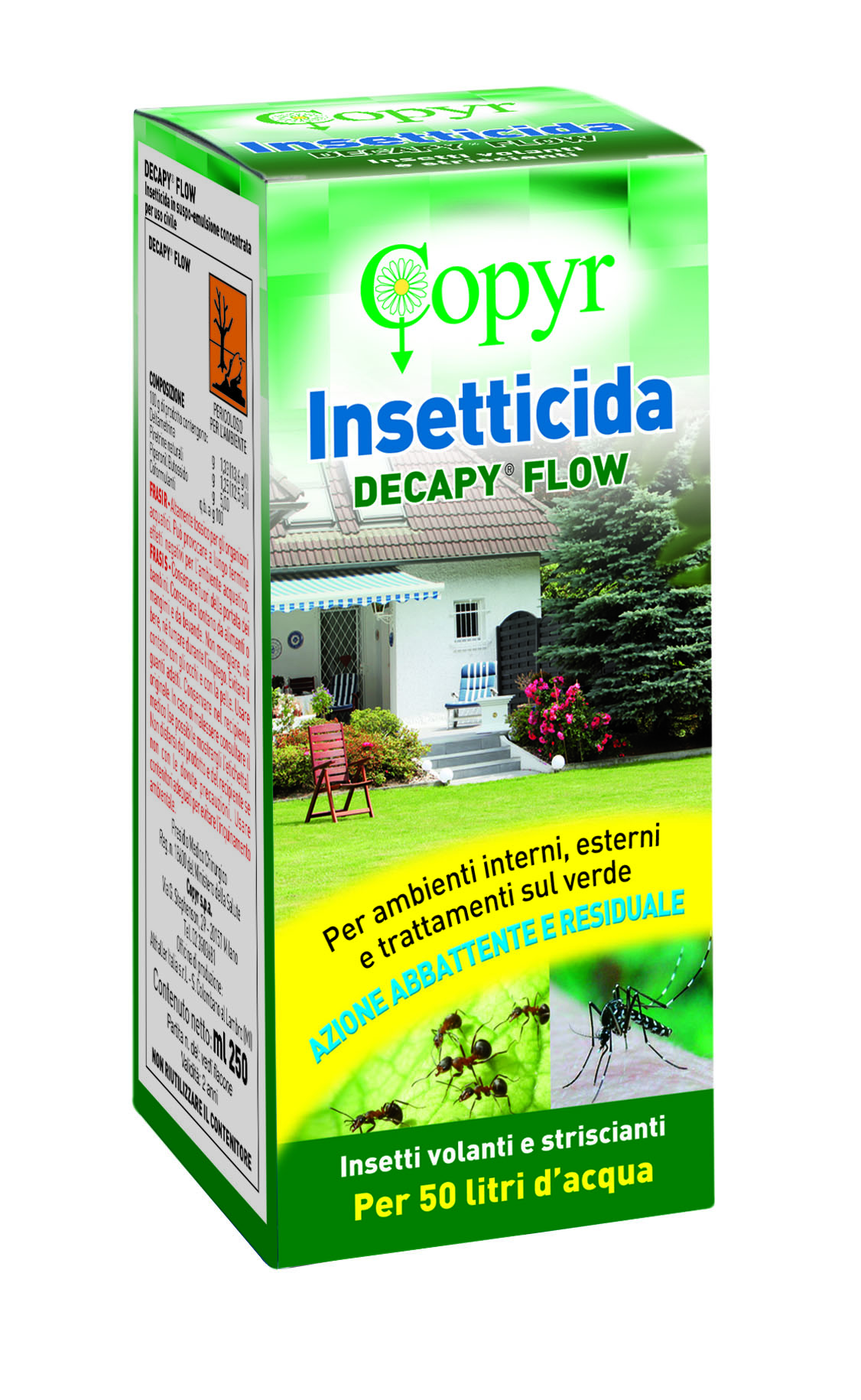 Copyr, in occasione della primavera, propone il nuovo insetticida Decapy Flow, un efficace rimedio contro mosche, zanzare ed i più comuni insetti stagionali molesti. Grazie alla sua particolare composizione a base di estratto naturale di Piretro e Deltametrina, Decapy Flow ha una rapida azione snidante e residuale. Può essere impiegato in ambienti esterni come facciate, vialetti, cortili, muretti, grondaie o sulla vegetazione contro mosche, zanzare adulte, inclusa la zanzara tigre e vespe. Questo insetticida può essere utilizzato anche negli ambienti interni contro scarafaggi, formiche, ragni, pulci e insetti delle derrate. Decapy Flow deve essere diluito in acqua e distribuito con una pompa a pressione ed è disponibile in comode taglie da 50ml, 250ml e 1litro con tappo contagocce o misurino dosatore.