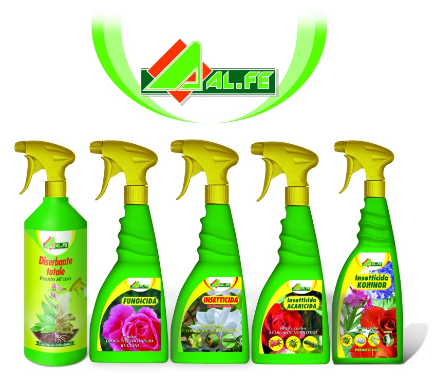 Un inconfondibile flacone verde con pompetta gialla identifica la nuova linea di insetticidi, fungicida e diserbanti liquidi per piante ornamentali di Al.Fe: una serie di prodotti completi per risolvere le infestazioni dainsetti, muffe ed erbacce. Questa nuova gamma è composta da cinque prodotti. L'insetticida Anticocciniglia, a base di olio minerale paraffinico è selettivo contro la cocciniglia. Acaricida agisce per contatto ed è specifico verso gli acari o comuni infestanti. L'insetticida Kohinor è un alleato prezioso ed universale ad ampio spettro e lunga persistenza. Fungicida in pompetta è una formulazione liquida con azione preventiva e curativa contro microorganismi come Oidio, Tichiolatura e Ruggini. In fine il Diserbante Totale possiede un'azione sistemica, agisce sulle radici attraverso il fogliame ed è studiato per le gestione controllata delle specie monocotiledoni e dicotiledoni. Tutti questi prodotti sono dotati di erogatore a getto regolabile per nebulizzare direttamente sulla pianta i prodotti pronti per l'uso.