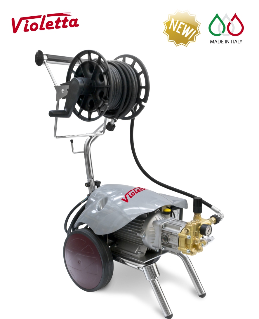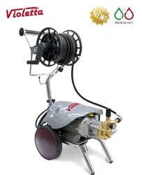 Molto maneggevole grazie al ridotto ingombro (440 L x 667 P x 950 H mm), Violetta è la nuova idropulitrice professionale presentata da Idrobase. Ad acqua fredda, questo modello è ideale per un uso continuativo (fino a 3 ore). La pompa assiale è “a vista” (2800 giri al minuto, testata in ottone, 3 pistoni in ceramica) per controllare l’eventuale necessità di manutenzione. Molto semplice (ON/OFF) è l’impianto elettrico (2800 g/min 50 Hz). Quattro i modelli: 2 in versione total-stop e 2 in versione by-pass, con una pressione che dai 130 ai 170 bar; portata 9 - 11 l/min; potenza 3 - 5 Hp fino a 3x400-50Hz. Fra gli accessori ci sono la pistola ECO e la lancia CDR 80.