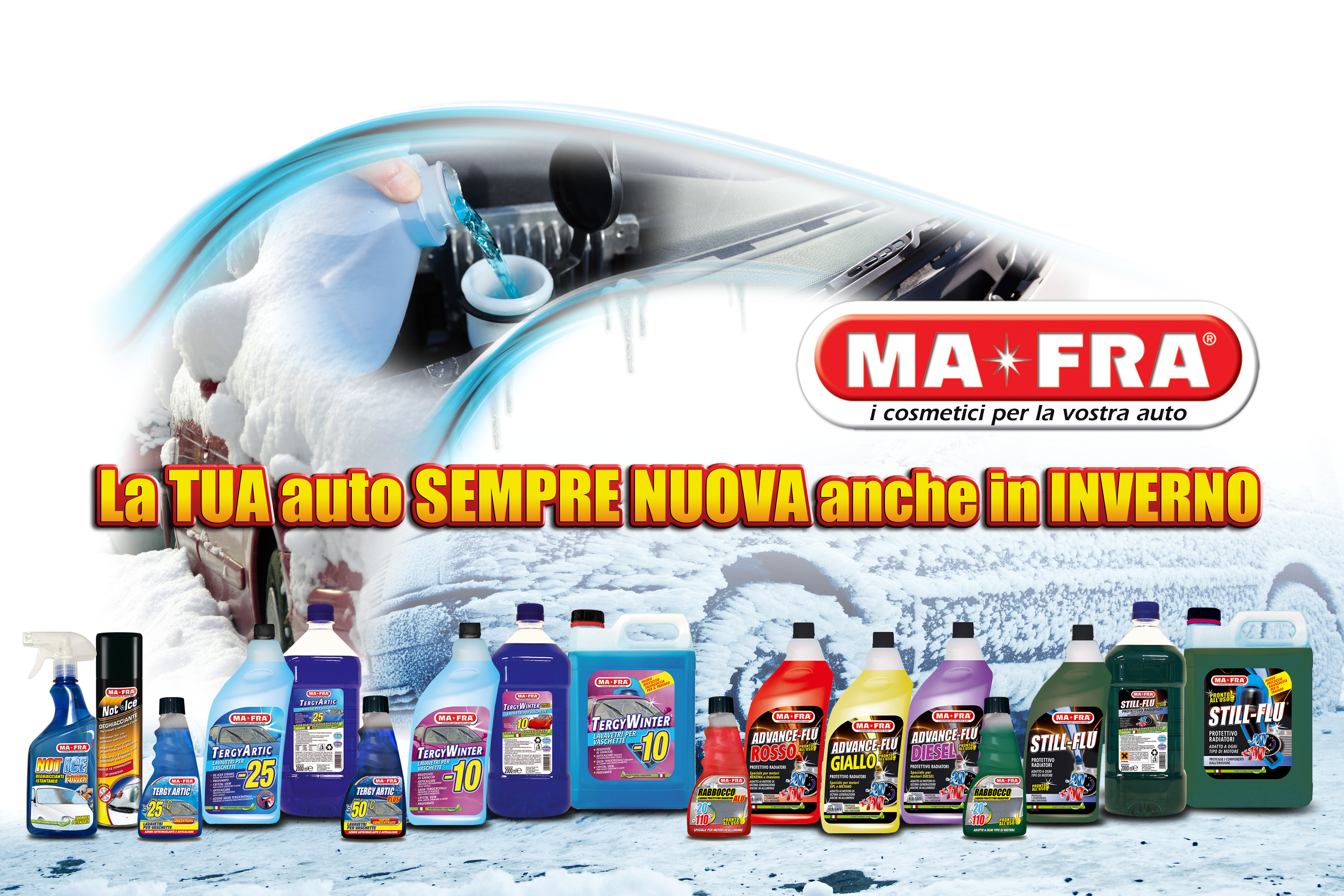 Dalla linea professionale MA-FRA sono nati deghiaccianti, liquidi per radiatore, detergenti per parabrezza e vaschette lavavetri.