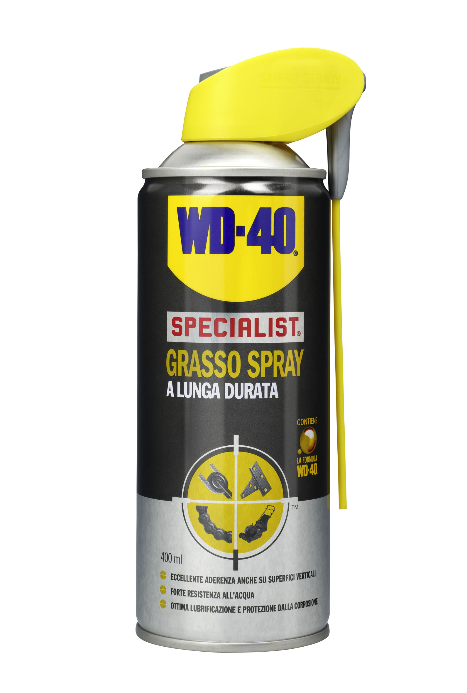 Le nuove Formule di WD-40 Specialist sono studiate nello specifico per risolvere differenti bisogni di lubrificazione, protezione dall’usura e dalla corrosione di attrezzature e ingranaggi. WD-40 grasso spray a lunga durata, nasce dalla formula di WD-40, combinata con grassi ed additivi ad elevata prestazione. Oltre che ad una lubrificazione estremamente duratura fornisce una efficace protezione dalla corrosione, inoltre l’eccellente aderenza alle superfici associata a proprietà sigillanti fanno sì che il prodotto non coli e resista all’acqua anche su superfici verticali. Grazie a queste caratteristiche, WD-40 grasso spray a lunga durata è ideale per l’uso in esterni e la manutenzione di parti meccaniche soggette agli agenti atmosferici. Raccomandato per Cardini, viti, serrande, guide, rulli, nastri trasportatori, catene, cavi, ingranaggi, cuscinetti, argani, utensili, etc.