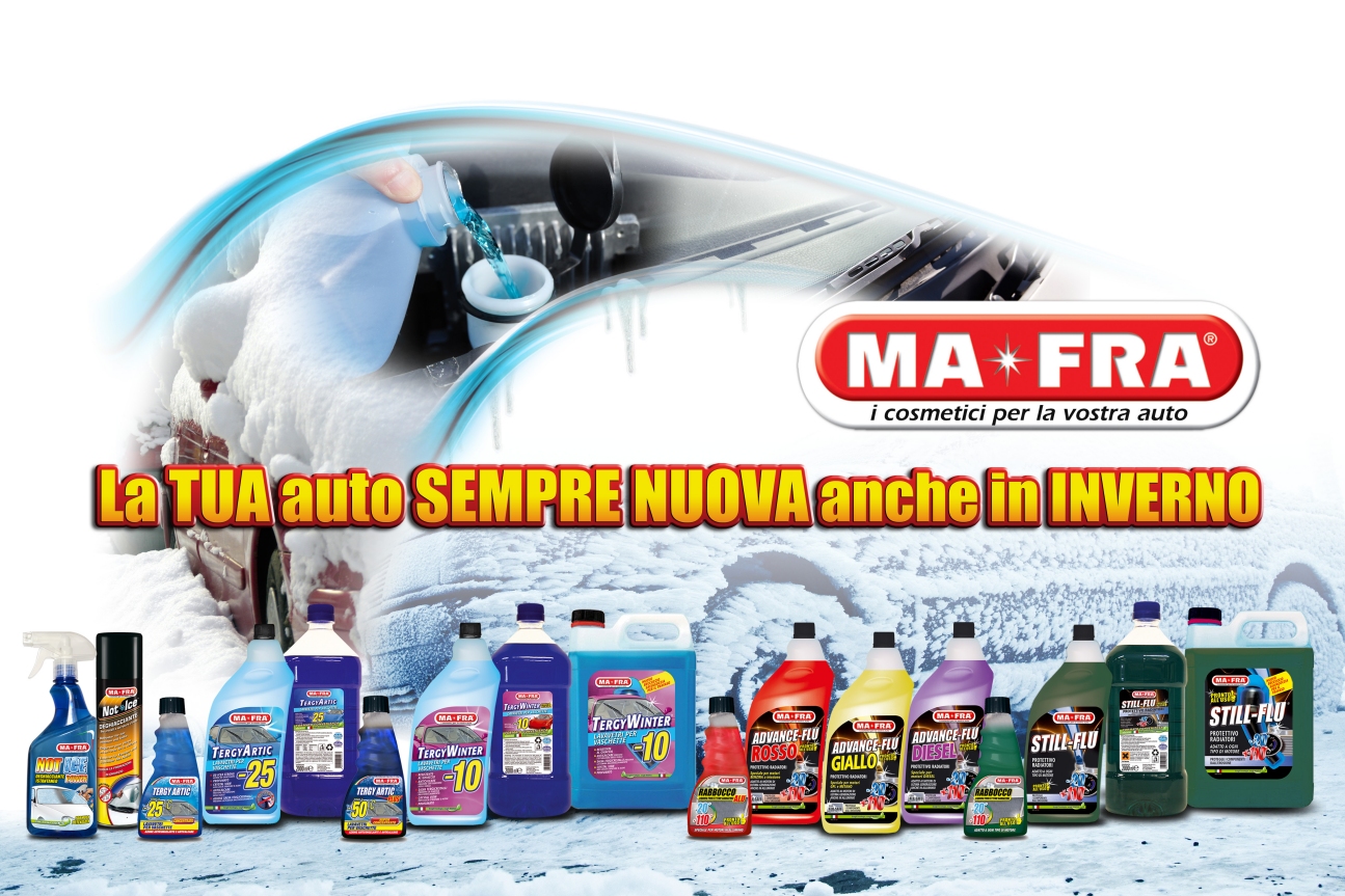 Con i suoi prodotti dedicati alla stagione fredda e un'ampia attività sul web e sui media tradizionali, Ma-Fra punta a diventare protagonista del nuovo inverno, soprattutto grazie alla qualità e alle performance dei suoi prodotti. La gamma offerta da Ma-Fra è di grande semplicità di utilizzo e dal packaging accattivante, i prodotti sono realizzati per andare verso le esigenze di tutti i propri clienti consumer. Dalla linea professionale Ma-Fra sono nati deghiaccianti, liquidi per radiatore, detergenti per parabrezza e vaschette lavavetri. I prodotti pensati e realizzati sono di tre famiglie: la linea Not Ice, deghiaccianti in formato liquido e spray; la linea Tergy, detergenti per parabrezza e vaschette lavavetri in differenti formati e formulazioni; le linee Still Flu e Advance Flu, liquidi per radiatore dedicati alle diverse tipologie di motore in differenti formati.