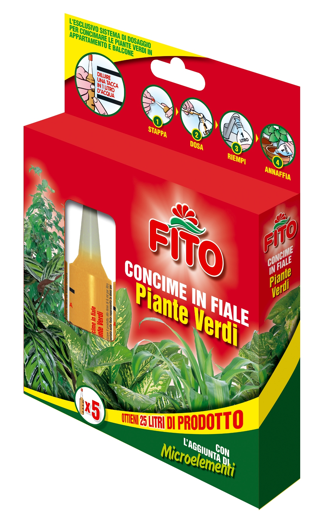 La gamma di concimi in fiale Fito si rivela un prodotto perfetto per la nutrizione delle piante nei mesi invernali, soprattutto quando si ha poca esperienza o poco tempo. Concime piante verdi arricchisce la fornita gamma di concimi Fito, rinno- vando il metodo di dosaggio che, tramite le fiale, consente di misurare la giusta quantità di concime senza sovradosaggio per la pianta o spreco di prodotto. Basta diluire una tacca della fiala in un litro d’acqua per produrre una dose settimanale. L’alta percentuale di Azoto e Ferro di questo concime permettono una rigogliosa crescita della pianta prevenendo fenomeni di ingiallimento fogliare. Il blister contie- ne 5 fiale da 30 ml ciascuna e consente di realizzare 25 litri di acqua d’irrigazione.