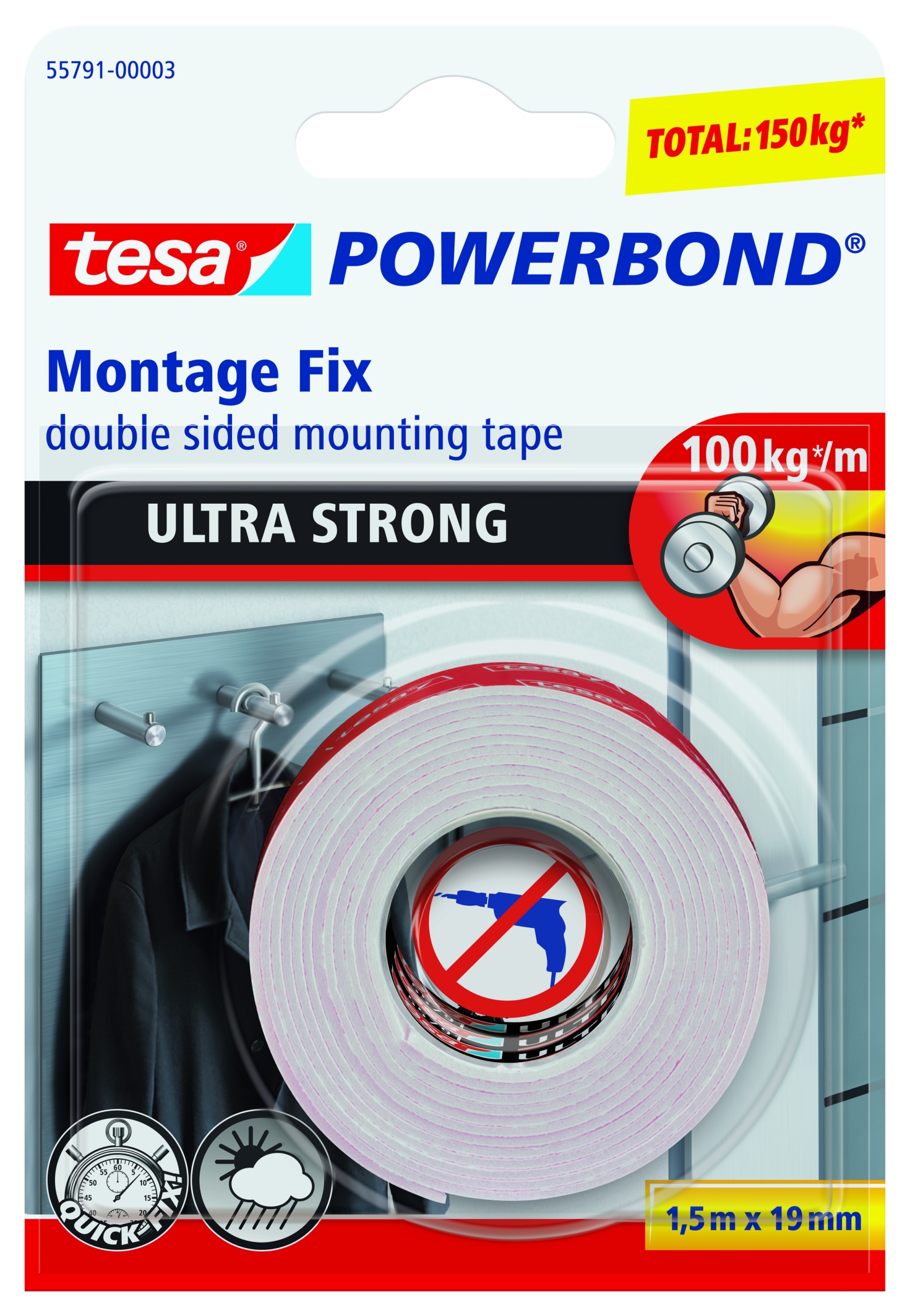 Dalla linea tesa Powerbond, il nastro biadesivo Tesa® extra-forte è indicato per lavori di fissaggio di oggetti pesanti. Una tenuta di lunga durata e un fissaggio sicuro e veloce sono decisamente garantiti, sia nei locali interni sia all’esterno, per diverse applicazioni. Regge fino a 10 kg (per oggetti con dorso liscio fino a 10 mm di spessore ) per 10 cm di nastro e sulla maggior parte delle superfici lisce e abbastanza strutturate.