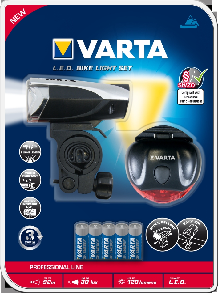 La luce anteriore è realizzata in plastica e alluminio con LED bianchi e con un raggio di luce estremamente potente in grado di illuminare fino a92 metri. Due le modalità di illuminazione: una normale (80 lumen) e una turbo (120 lumen), che consentono di utilizzare il fanale in modalità risparmio energetico su strade ben illuminate e in modalità turbo in condizioni di scarsa illuminazione, garantendo sempre una buona visibilità e un grado di sicurezza elevato. La luce posteriore è realizzata in plastica dura con tre LED rossi. Le luci Varta LED Bike Light consentono di individuare il ciclista con un angolo di 220° ed entrambe sono conformi allo standard tedesco StVZO, uno dei codici stradali più attenti alla sicurezza, all’avanguardia d’Europa.