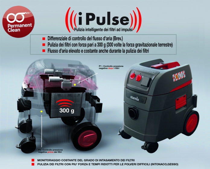 L’estate si apre con l’ultima novità di R.E.I.T.SpA, distributore in esclusiva per l’Italia del programma di aspirapolvere Starmix: il nuovo Starmix iPulse. Gli aspirapolvere Starmix iPulse si distinguono per l’avanzato sistema di pulizia automatica dei filtri. Un sistema elettronico molto intelligente utilizza sensori per misurare costantemente lo stato di intasamento dei filtri. Nel caso in cui venga superato il valore di soglia, l’aspirapolvere pulisce i filtri uno dopo l’altro tramite vibrazione, senza interrompere il lavoro di aspirazione. È grazie all’utilizzo di elettromagneti ad alte prestazioni che le forze che si generano raggiungono 300 volte la forza gravitazionale terrestre (300 g) ed è possibile raggiungere l’obiettivo: anche le polveri più insidiose e compatte, problema particolarmente riscontrato con la polvere di gesso, possono facilmente essere rimosse dai filtri. Il risultato è immediatamente evidente. Questo tipo di pulizia alternata dei filtri garantisce all’aspirapolvere un flusso d’aria costante ed elevato fino al riempimento del contenitore.