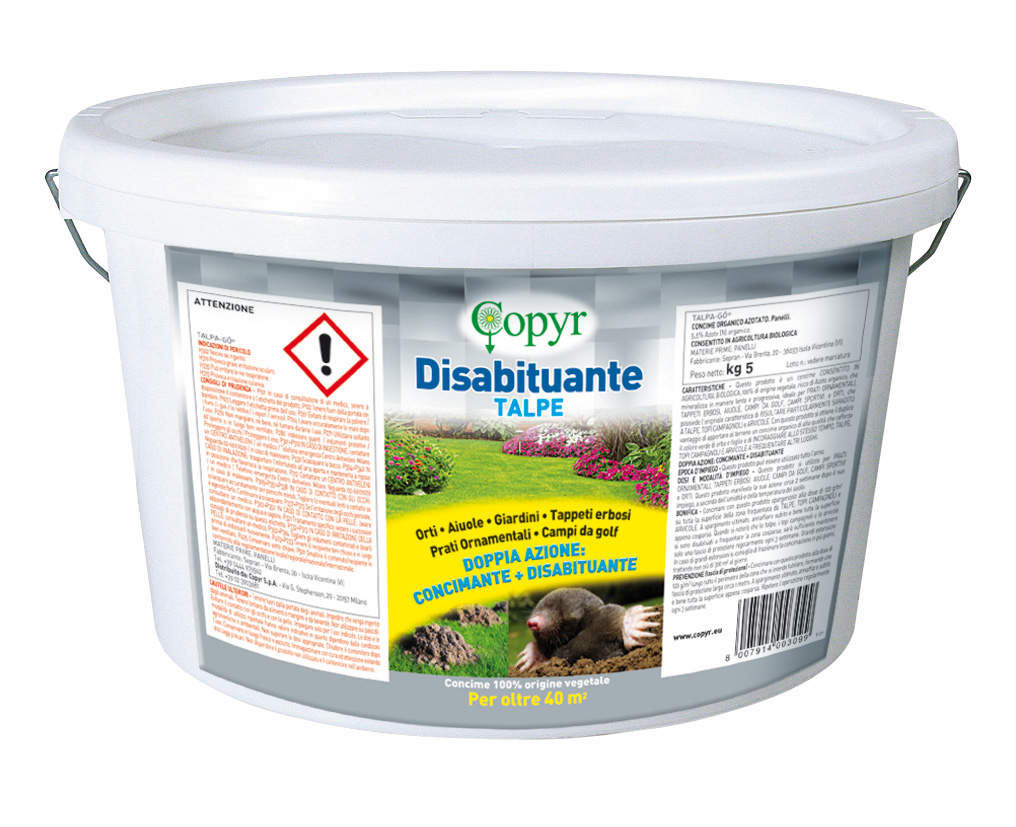 I fori provocati delle talpe all’interno di un orto o di un giardino, a differenza di quanto succede in natura, possono risultare molto fastidiosi; Copyr presenta due prodotti completamente ecologici capaci di risolvere questo problema. Talpa Go è un concime naturale con una forte azione repellente nei confronti di talpe, topi campagnoli ed arvicole che infestano prati, tappeti erbosi, campi da golf, aiuole e orti. La sua composizione favorisce l’attività microbica del terreno ed allo stesso tempo agisce come disabituante ecologico sui piccoli roditori. Il secondo prodotto si chiama Talpa smoke e come suggerisce il nome agisce tramite una cortina di fumo all’interno delle gallerie costruite nel sottosuolo; anche questo prodotto è di origine naturale grazie alla composizione di olio di ricino che crea una vera e propria barriera fisica.