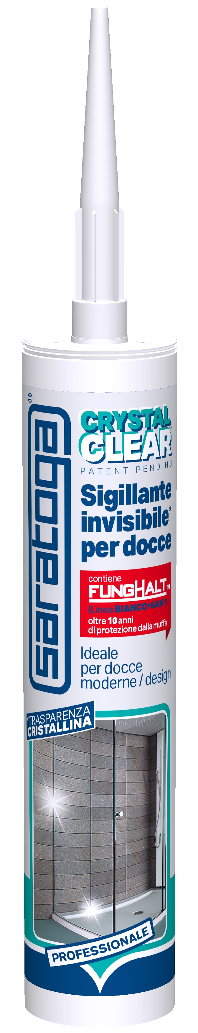 Un buon silicone per doccia deve garantire determinati risultati: la soluzione di Saratoga è Crystal Clear, il nuovo sigillante monocomponente per sigillature perfette, invisibili e durature nel tempo. La sua primaria caratteristica è proprio la trasparenza, quasi fosse vetro e, al pari degli altri prodotti della linea Biancosan, contiene Funghalt, il potente fungicida che impedisce la proliferazione di batteri o funghi e garantisce la protezione dalla muffa per oltre 10 anni. Estremamente resistente alla luce, all’umidità e alle vibrazioni, offre anche una grande tolleranza all’acqua calda o ai comuni detergenti e una totale compatibilità con la maggior parte dei materiali presenti nei bagni, anche i più delicati, come vetro, marmo, ceramica, alluminio ecc. Crystal Clear è senza solventi, inodore, elastico, non cola e si estrude con una pistola per silicone di buona qualità.