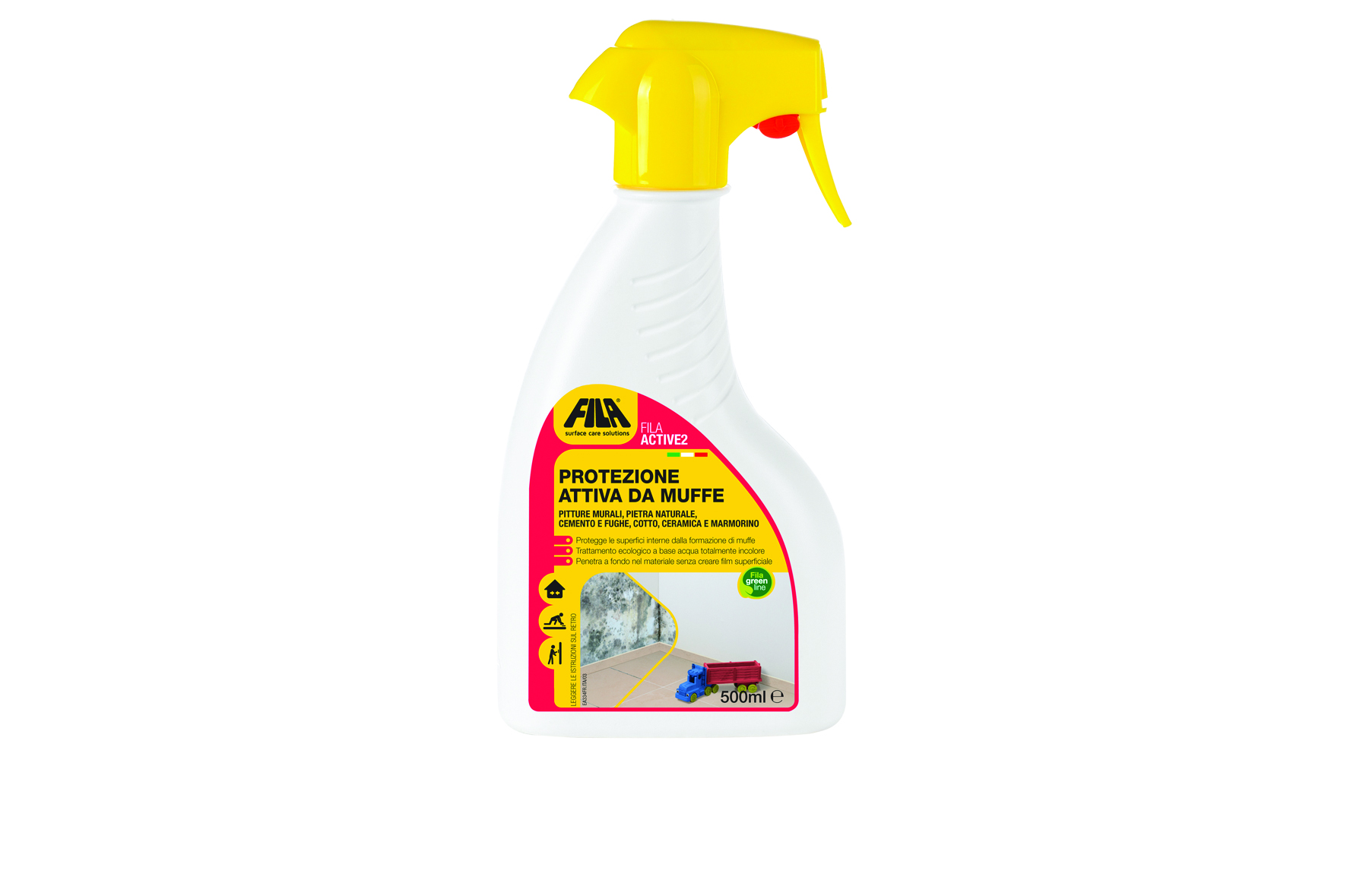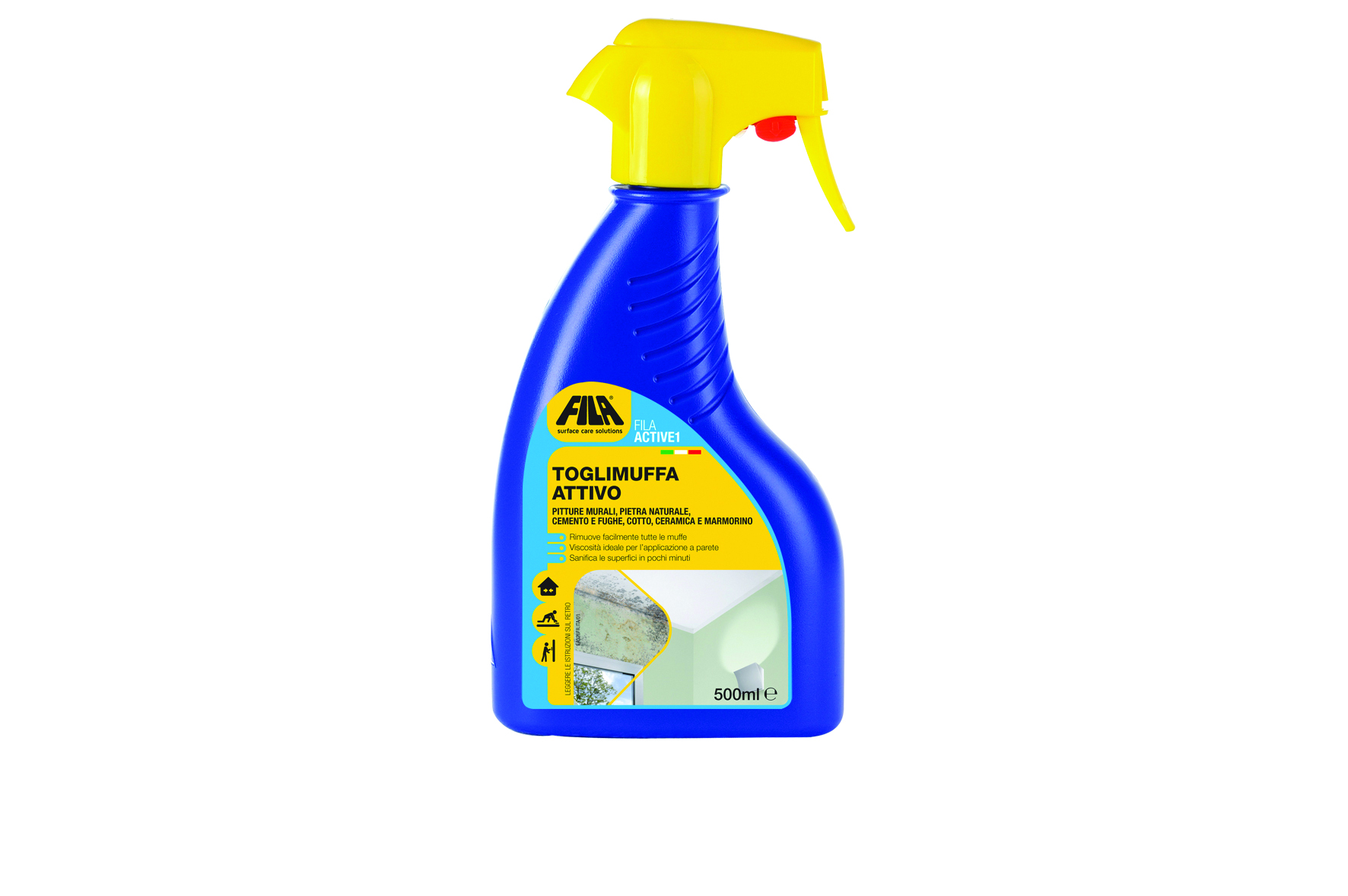 Per sconfiggere la muffa ci vogliono le strategie giuste e per questo Fila propone FILAACTIVE1 e FILAACTIVE2: il primo la elimina, il secondo la previene. Pareti intonacate, garage e cantina, sauna, bagno e doccia sono alcuni dei luoghi in cui più facilmente si verifica il problema. Pronto all’uso, senza essere diluito, FILAACTIVE1 va spruzzato direttamente sulla superficie e lasciato agire per 15 minuti. Per un’azione preventiva, ideale è FILAACTIVE2, protettivo a base acqua che sanifica la superficie ostacolando la colonizzazione di muffe, evita l’annerimento da umidità sulle pareti interne e può essere utilizzato ugualmente come protettivo di fondo prima di tinteggiare. Anche questo prodotto è semplice da usare: si spruzza abbondantemente e uniformemente tenendo il flacone in posizione verticale a una distanza di circa 15-20 cm dal punto di applicazione. Sono entrambi disponibili in confezioni ergonomiche con spruzzatore da 500 ml.