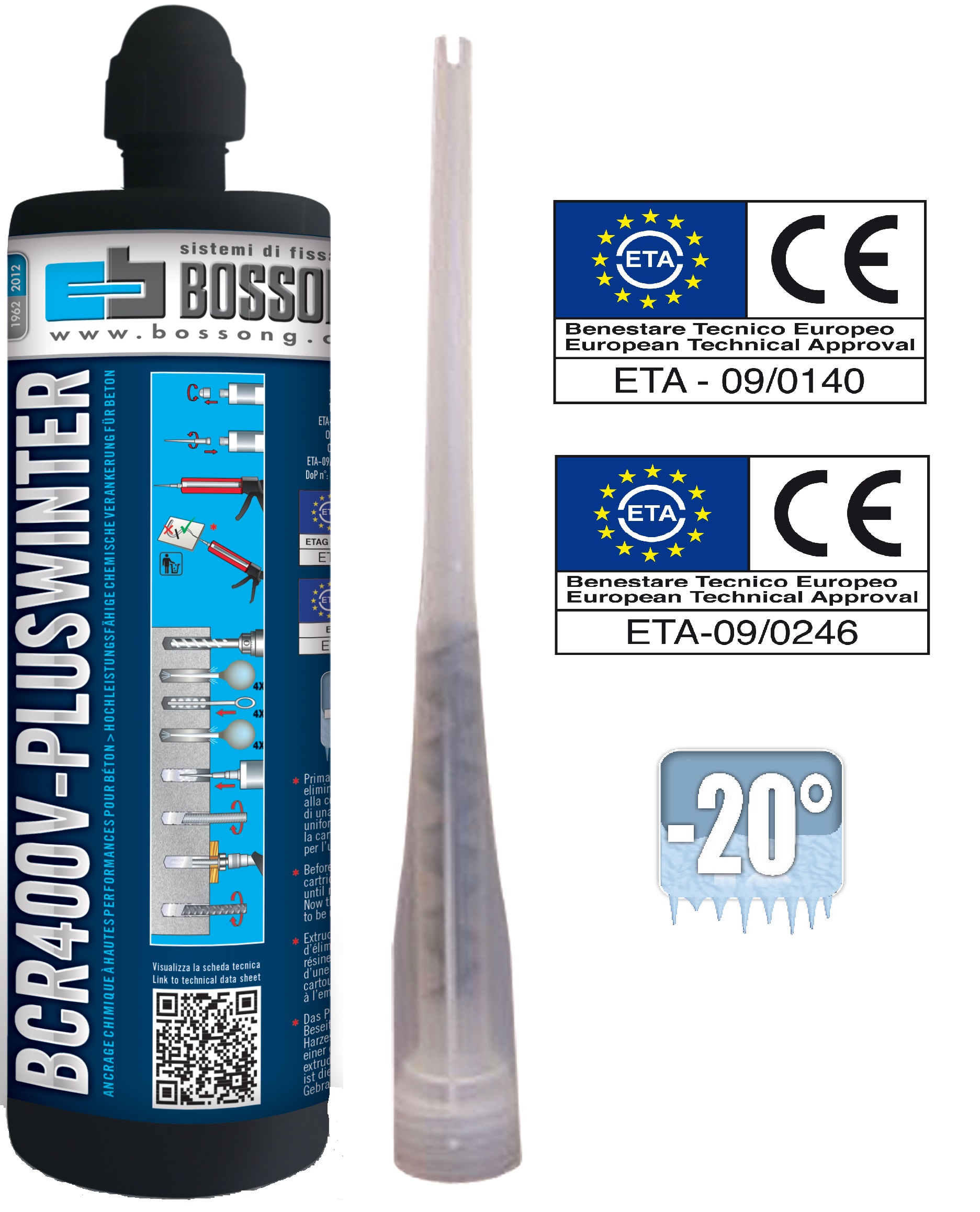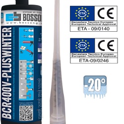 BCR Winter V-Plus di Bossongè una resina vinilestere senza stirene bi-componente per carichi pesanti per fissaggi in calcestruzzo, muratura piena, laterizi forati e legno. Formulazione speciale per applicazioni nel periodo invernale fino a –20 °C di temperatura ambiente. Tempi di posa in opera ridotti anche a basse temperature.