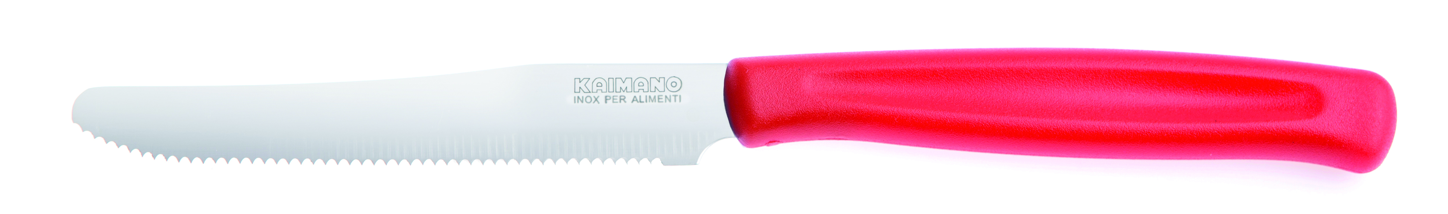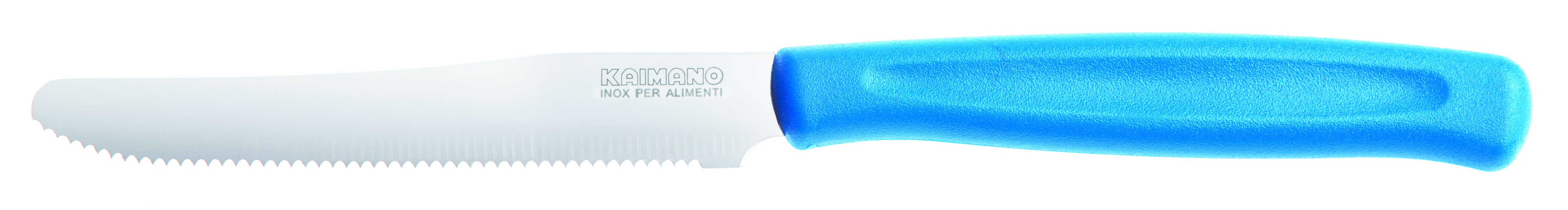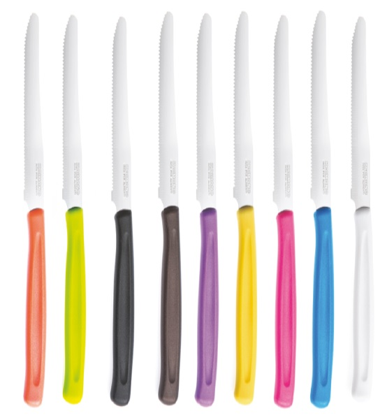 I coltelli da tavola Dinamik di Kaimano sono progettati per tagliare in sicurezza con il minor sforzo possibile. Si identificano per la punta arrotondata e la lama seghettata e sono proposti con il manico in 10 brillanti colori: nero, bianco, marrone, fucsia, verde acido, rosso, arancione, giallo, blu e lilla. L’offerta di coltelli da tavola Kaimano comprende, inoltre, due speciali coltelli da tavola dotati di lama che combina punta dentata e filo liscio, per sbucciare la frutta più facilmente. Lunghezza lama: 11 cm