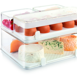 I contenitori per frigorifero Purity di Tescoma sono prodotti con uno speciale materiale utilizzato anche in ambito medico e farmaceutico: è neutro e non altera le qualità dei cibi, quindi ideale per conservarli in modo perfettamente igienico. Il fondo dei contenitori è utilizzabile da entrambi i lati, ha una superficie speciale che evita che gli alimenti assorbano umidità e il bordo rialzato che previene le perdite di condensa. Sono salvaspazio e impilabili, come tutti gli altri contenitori della stessa linea; per chiuderli è sufficiente far scattare le clip.