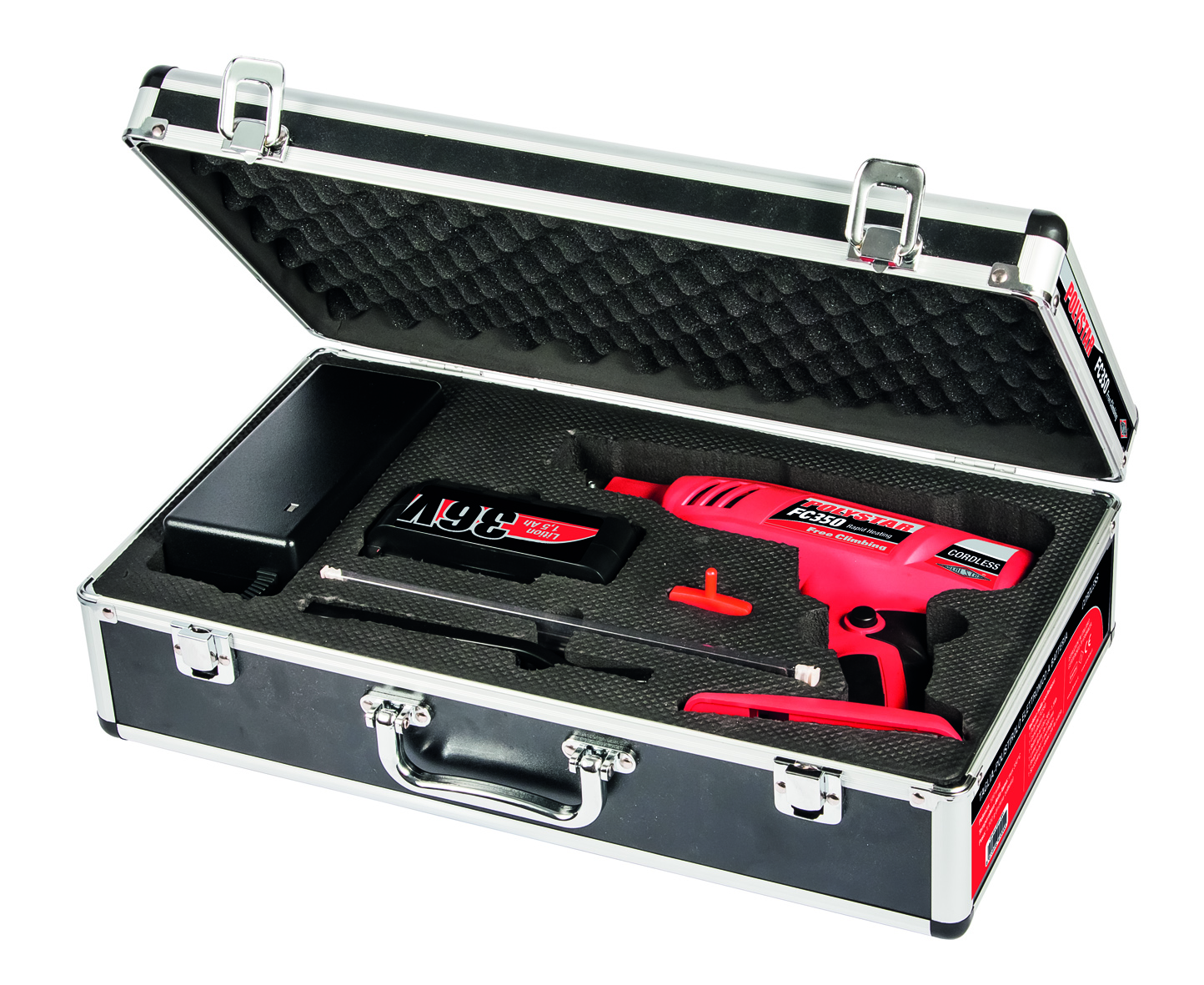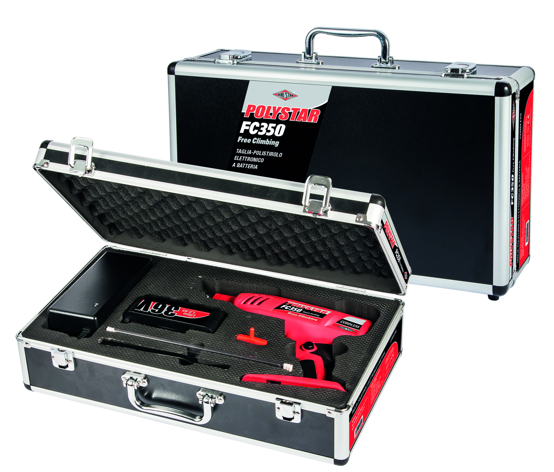 Polystar FC350 è confezionato in valigetta professionale antiurto con finiture metallizzate. La confezione include 1 lama diritta da 200 mm, batteria e carica batteria, brugola di montaggio e spazzolino per la pulizia.