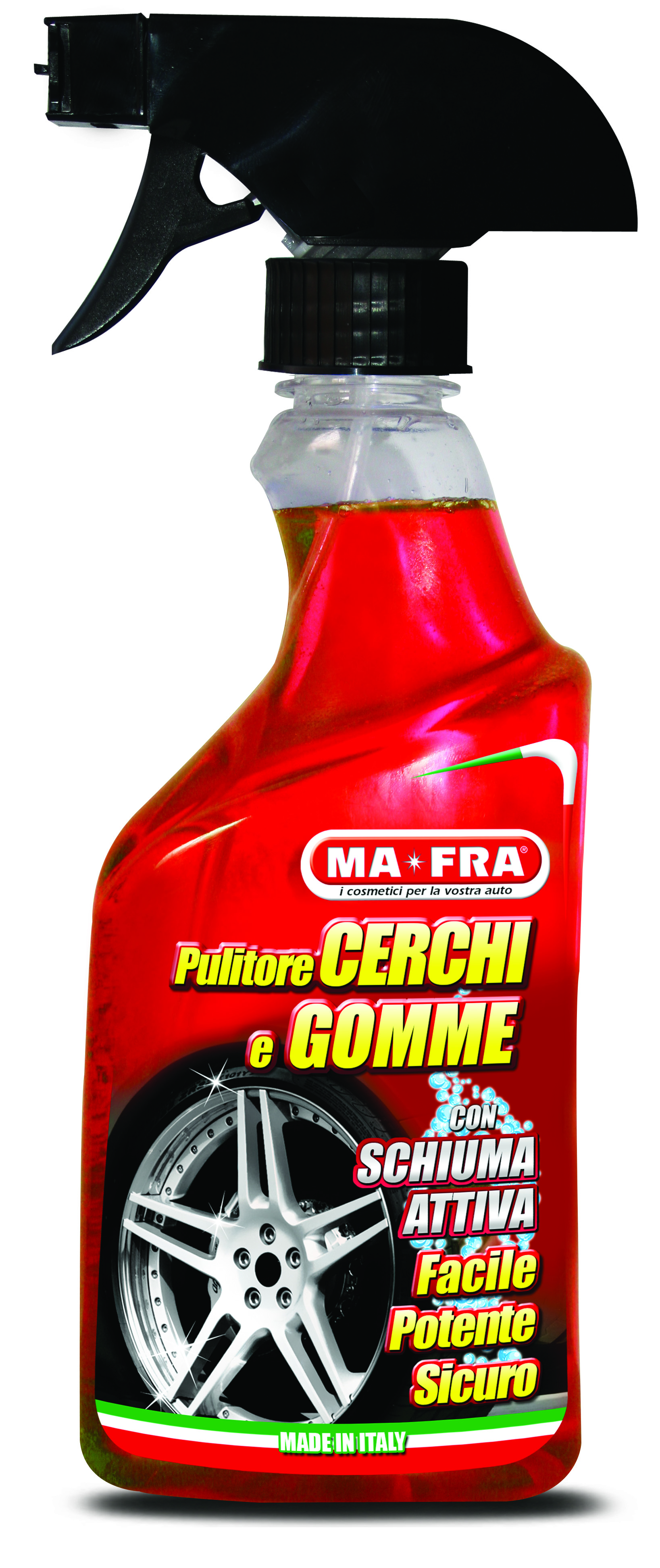 L’idea di MA-FRA è stata di creare un prodotto “2 in 1”: Pulitore cerchi e gomme, per pulire perfettamente il cerchio e detergere in profondità la gomma, garantendo maggiore aderenza al lucidante che verrà successivamente applicato per far brillare il pneumatico.