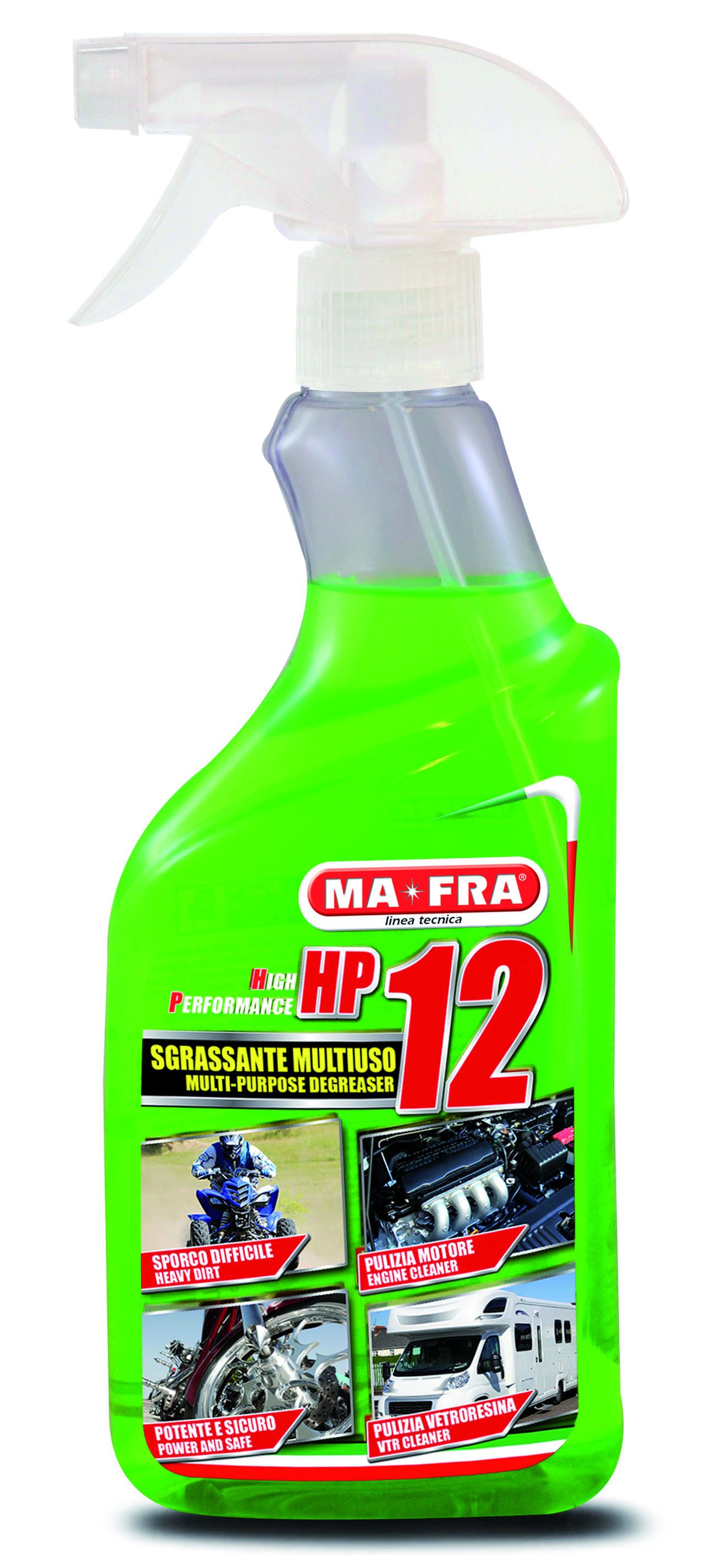 Per ripulire dallo sporco più difficile moto, camper e barche, utensili e accessori fai da te, arredi domestici e oggettistica e anche il motore, Ma-Fra propone HP 12, un potente sgrassante multiuso che agisce in profondità ma in sicurezza, rispettando le parti trattate senza intaccarle in modo aggressivo.