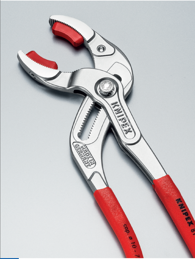 Nel catalogo Knipex ci sono le pinze per sifoni, tubi di plastica e connettori fino al diametro 80 mm, che permettono una regolazione fine per un adattamento ottimale ai vari diametri.