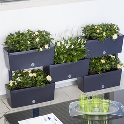 La confezione contiene: cinque fioriere complete; due tubolari di supporto; cinque tappi di livello; otto tappi di chiusura; un libretto di istruzioni.