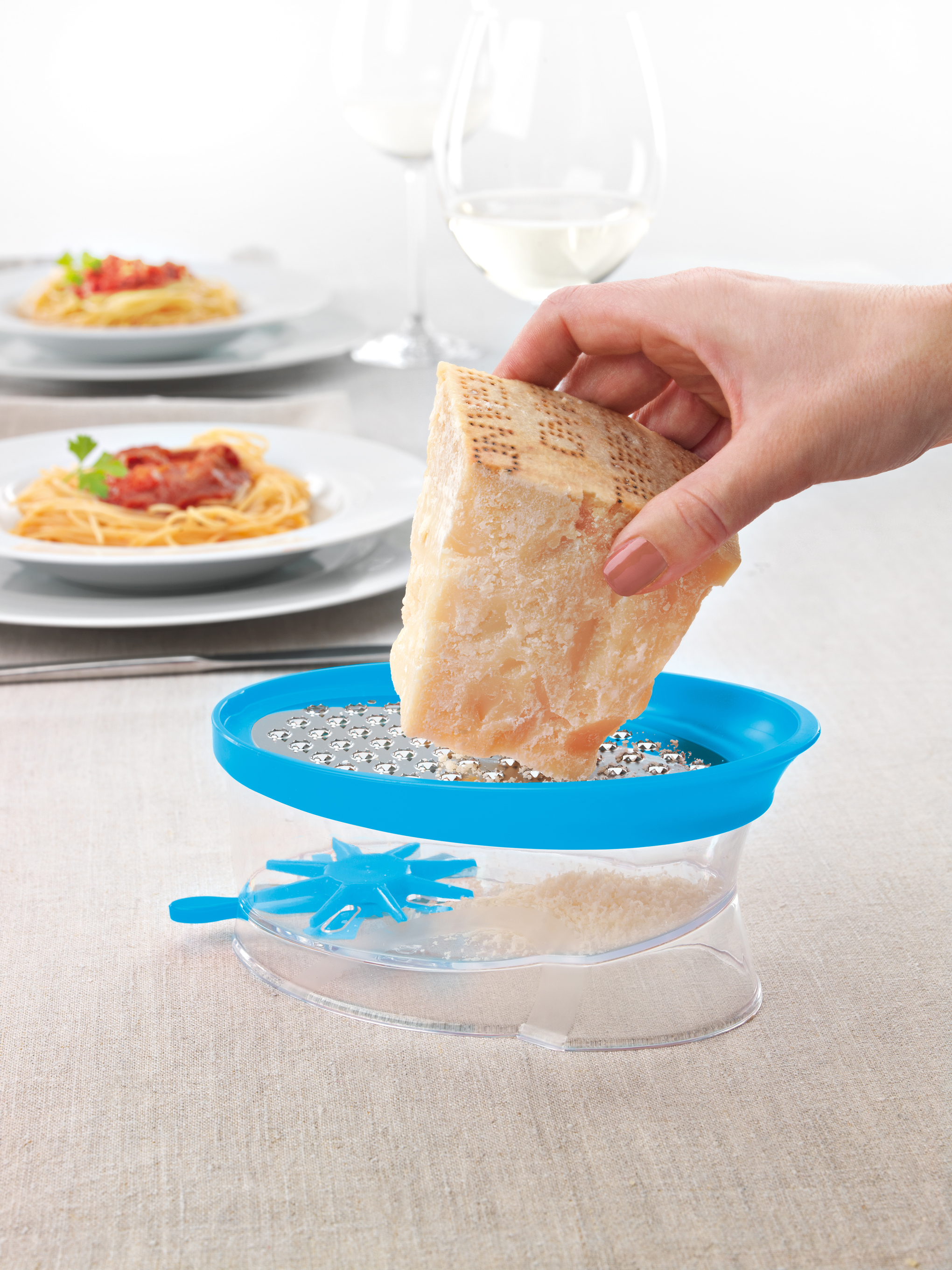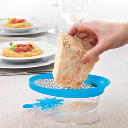 Forme tondeggianti e design accattivante caratterizzano la grattugia Gradosa, prodotta dall'azienda Meliconi, che è anche un pratico contenitore-dosatore. Il profilo bordato aiuta a non disperdere il formaggio, invitandolo a cadere al suo interno. Con un “click” si dosa poi la giusta quantità di formaggio; chiusa con il proprio coperchio trasparente, diventa un utile contenitore salvafragranza da riporre in frigorifero.