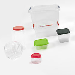 La serie PET è realizzata in PET trasparente (idoneo al contatto con gli alimenti) per conservare il cibo secco come pasta, riso, biscotti e dolciumi, o come porta sale, pepe e spezie di vario genere. Disponibili in diversi formati, hanno coperchi con o senza manico, a pressione o tappo a vite, con foro grande o a foratura fine, coperchi in latta e coperchi spargisale.