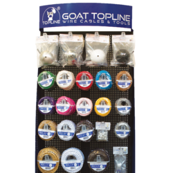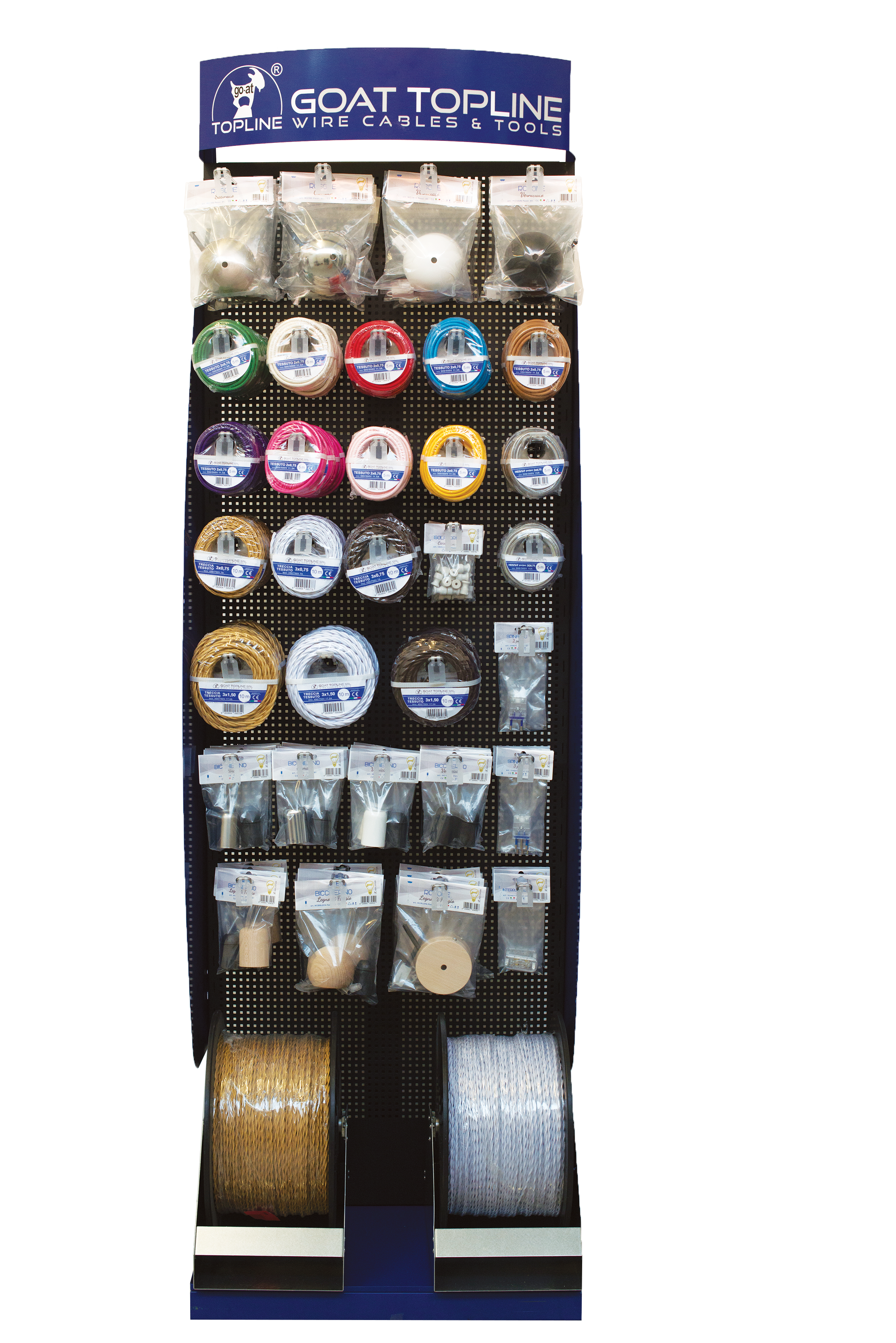 Go-at Topline srl ha realizzato un esclusivo espositore di illuminotecnica, per rendere più semplice e divertente la costruzione del pendel grazie all'utilizzo di 6 i componenti. Il primo elemento è il rosone, presentato nella versione più classica cromato o satinato, in quella più moderna verniciato bianco o nero e in quella artigianale in legno di faggio. Il secondo componente è costituito dai cavi: tondi H03VV-F, con rivestimento in treccia tessile, disponibili in nove diverse varianti di colore; in treccia tessile FRRTX oppure trasparenti polarizzati blu, marrone e giallo/verde. Terzo elemento sono i bicchierini portalampada, in perfetto abbinamento con i diversi tipi di rosone. Infine, vi sono isolatori di ceramica bianchi, interruttori rompifilo e due diversi tipi di spine 10A, una a 2 poli e l’altra a 2 poli con Terra.