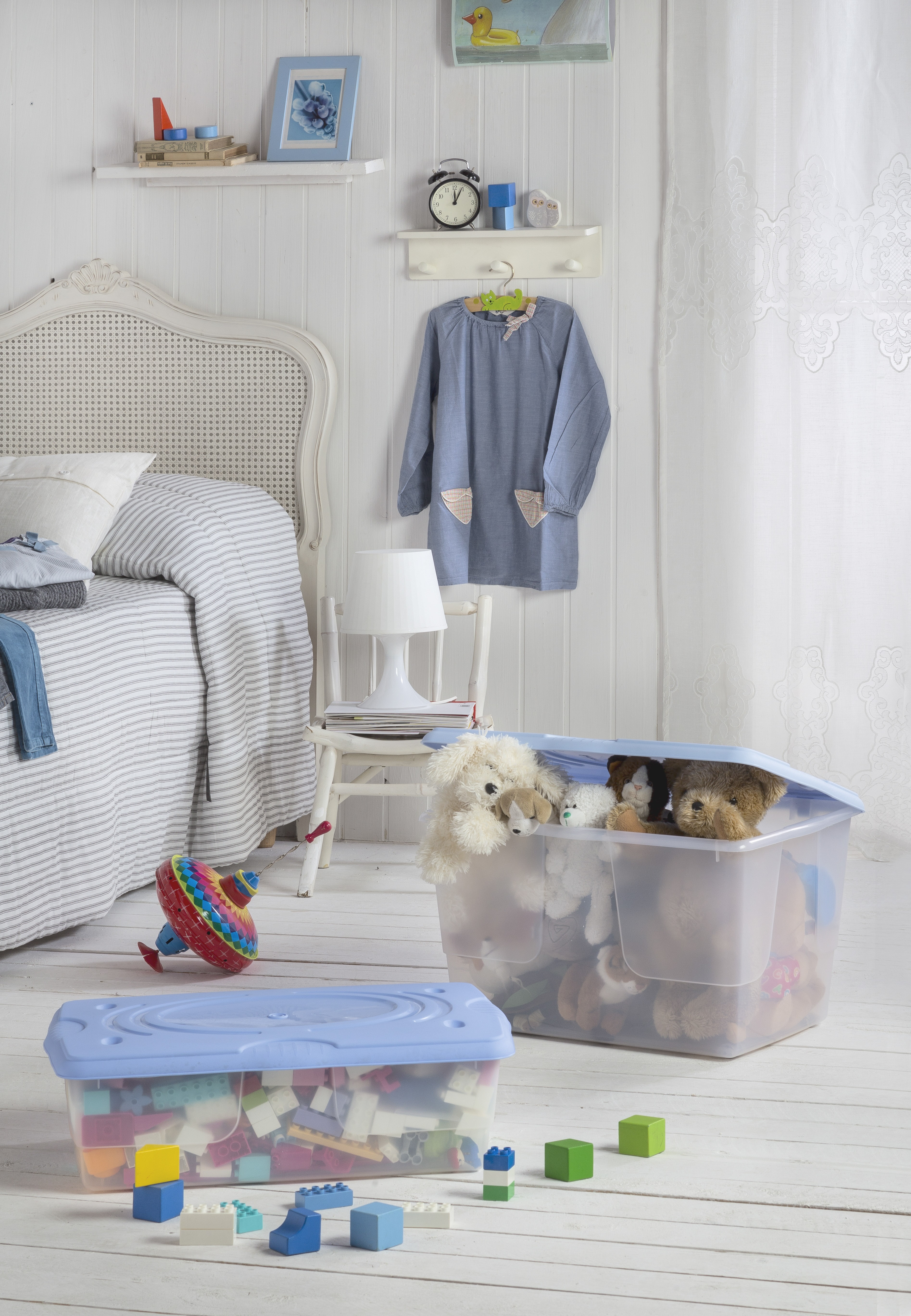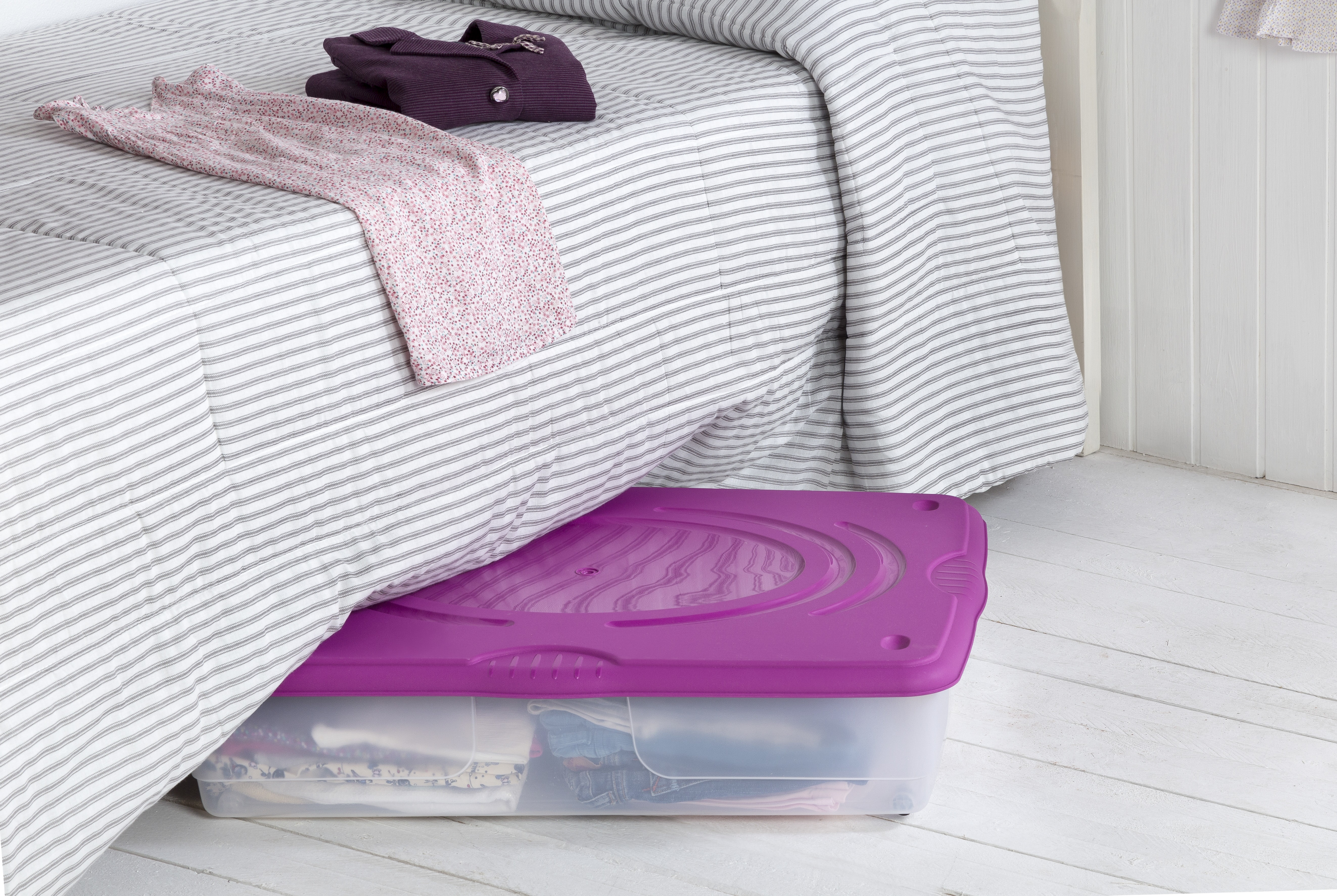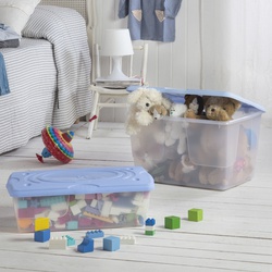 Hanno un comodo coperchio con chiusura a scatto e un particolare design con alloggiamenti per le ruote che permettono di poterli impilare l’uno sull’altro. Questi contenitori sono molto robusti e grazie alle loro dimensioni possono anche essere nascosti sotto il letto.