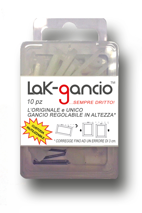Lak-gancio è l’originale e unico gancio appendi quadri con sistema di regolazione in altezza.
