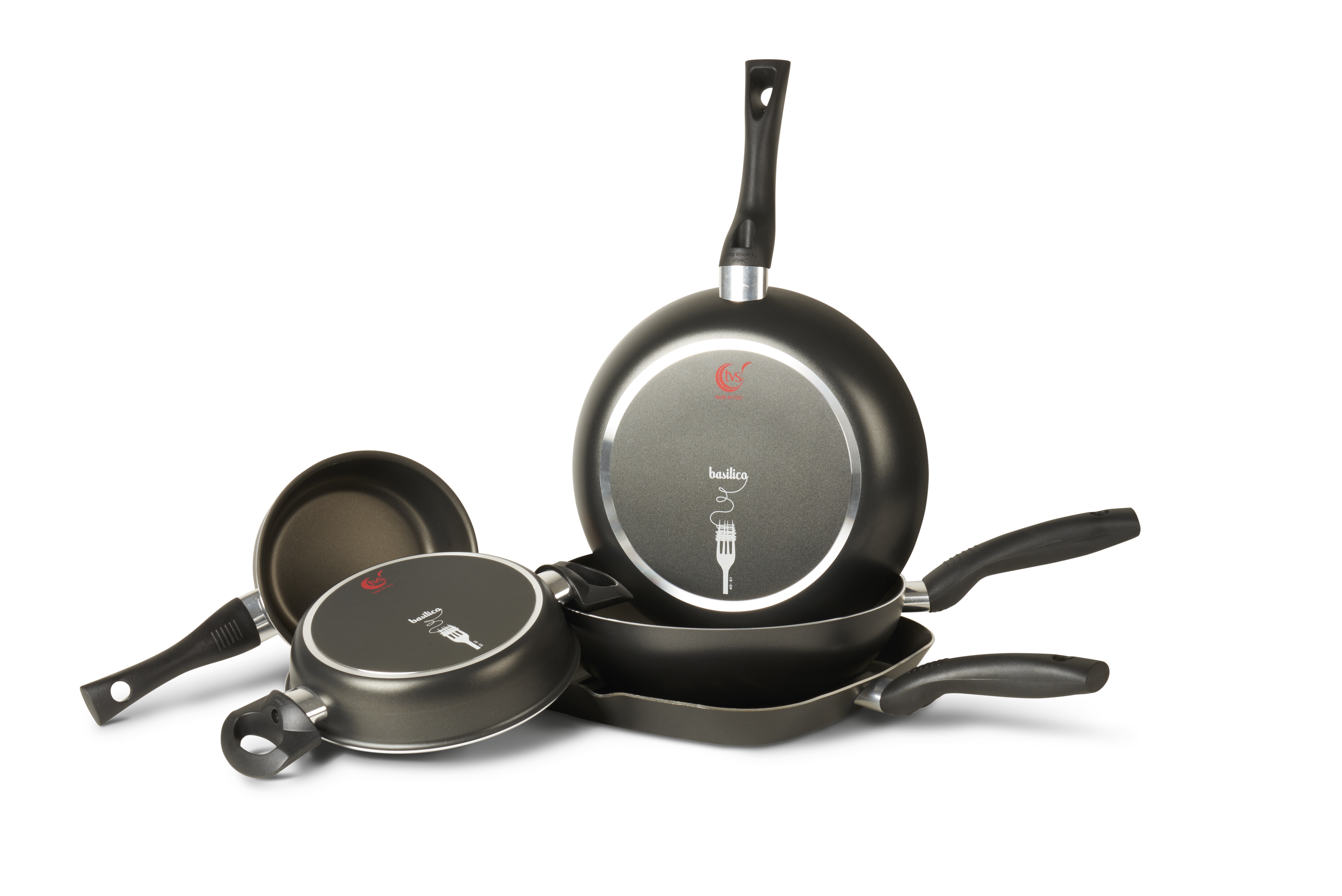 Si caratterizza per le forme pratiche e leggere la linea di strumenti di cottura Basilico di TVS, dotata di rivestimento antiaderente Ipertek.