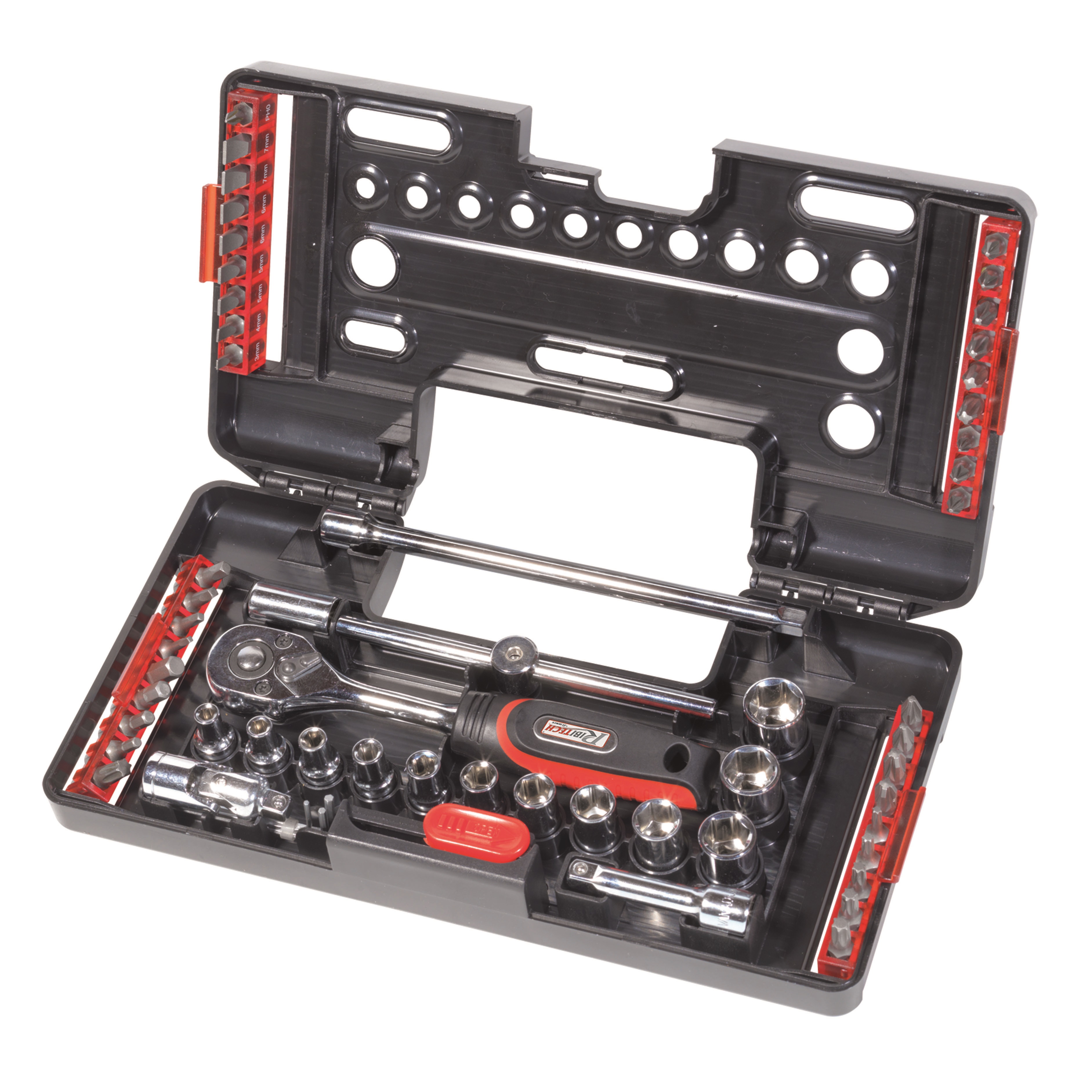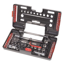 Per una maggior robustezza tutti gli utensili sono realizzati in cromo vanadio (salvo gli inserti). Le chiavi a bussola sono esagonali per una maggiore resistenza. Il cofanetto comprende: 1 chiave a cricchetto reversibile 1/4’’ 45 denti; 12 chiavi a bussola - 1 snodo cardanico; 1 prolunga 50 mm - 1 prolunga 150 mm; 1 leva a T - 3 chiavi Allen (1,5 – 2 - 2,5 mm); 1 porta inserti + 36 inserti 25 mm (8 per viti a intaglio, 7 Phillips, 7 Pozidriv, 4 esagonali, 6 Torx, 4 quadrate).