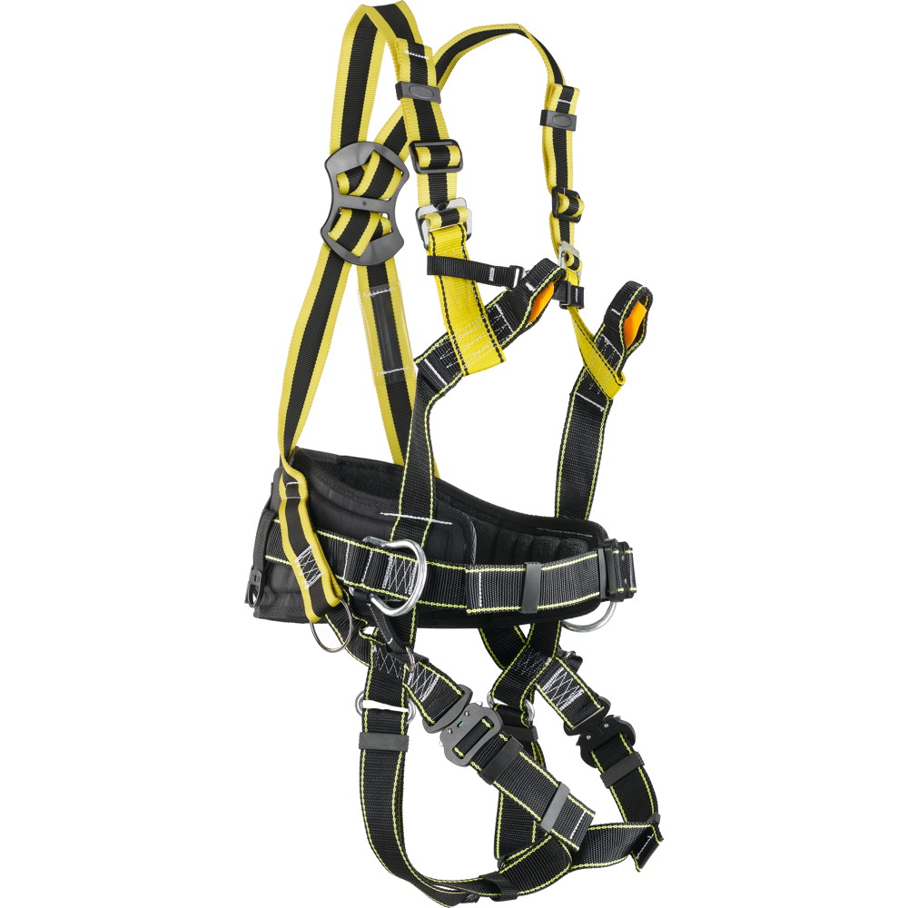 La nuova imbracatura NT07 ha bretelle realizzate con fasce elastiche; fibbie di regolazione per cosciali e cintura a sgancio rapido; ampia cintura di posizionamento con vari anelli portautensili e con imbottitura in spugna che assorbe il sudore.