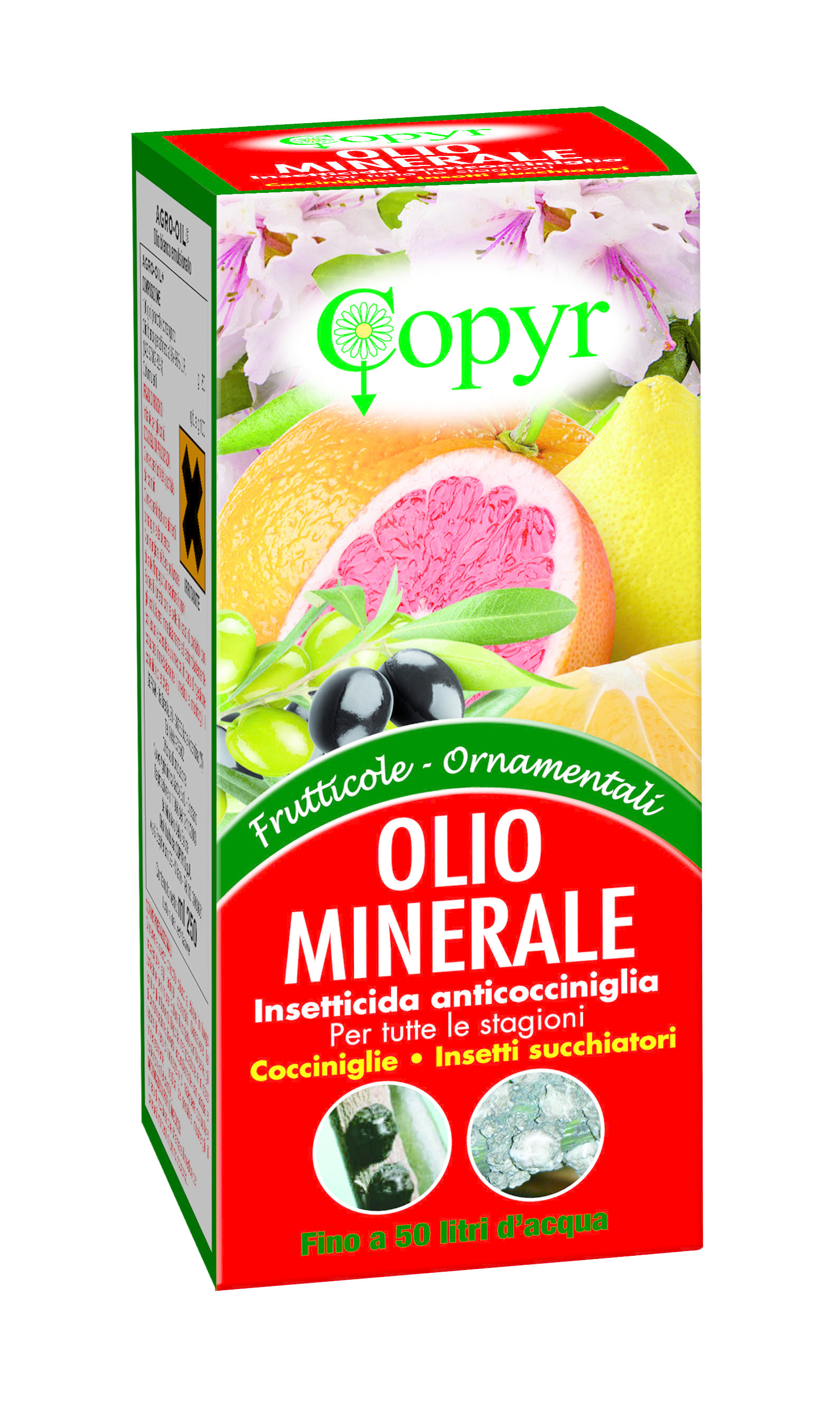 L’Olio Minerale di Copyrè un insetticida attivo contro le varie specie di cocciniglie che attaccano le colture frutticole e ornamentali in tutte le stagioni. Il prodotto, ammesso in agricoltura biologica, si impiega sia nei trattamenti invernali, prima della ripresa vegetativa, che in applicazioni primaverili ed estive. Si tratta di un’emulsione concentrata composta da olio bianco raffinato, da diluire prima dell’utilizzo secondo le dosi indicate in etichetta. Si consiglia di sospendere i trattamenti 20 giorni prima della raccolta. L’Olio Minerale, dotato di misurino incluso nella confezione, è disponibile in astuccio da 250 ml e flacone da 1 lt.