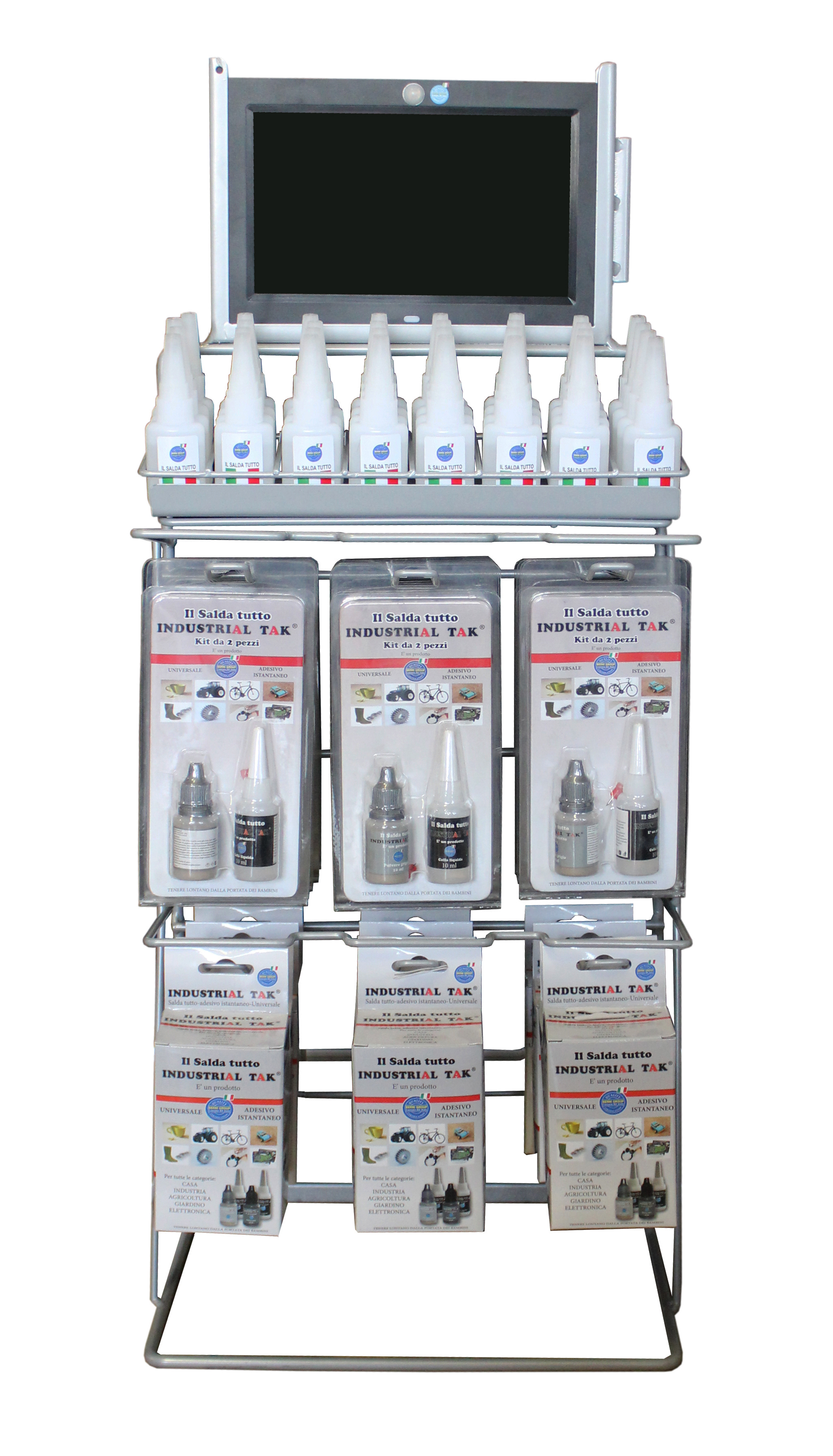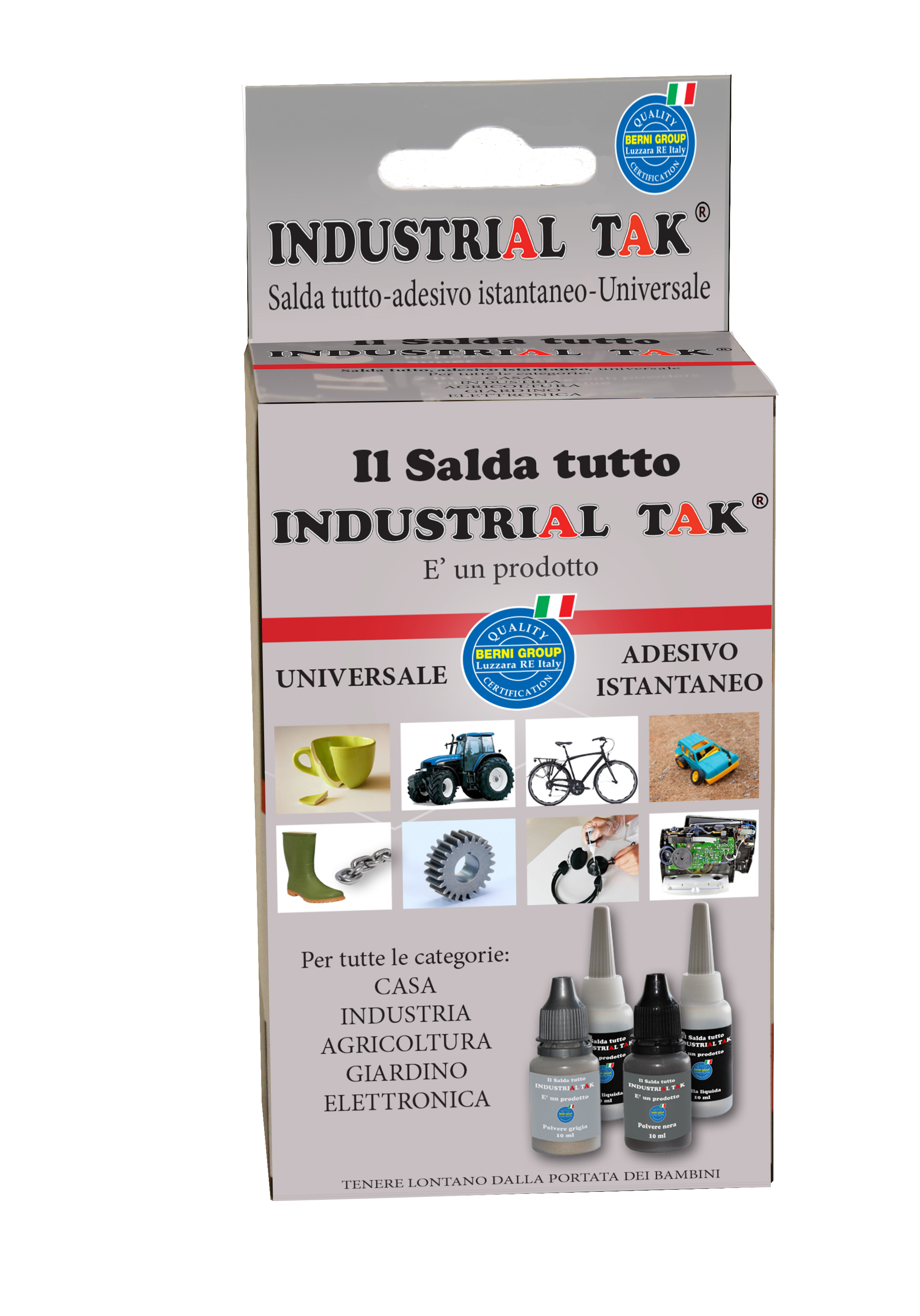 Industrial Tak è nata con la stessa formula adesiva di Salda Tutto, ma oltre a essere usata nel fai da te, viene impiegata anche nell’industria meccanica e zootecnica, per saldare vetro, metalli, legno, plastica, gomma, marmo, ceramica ecc.