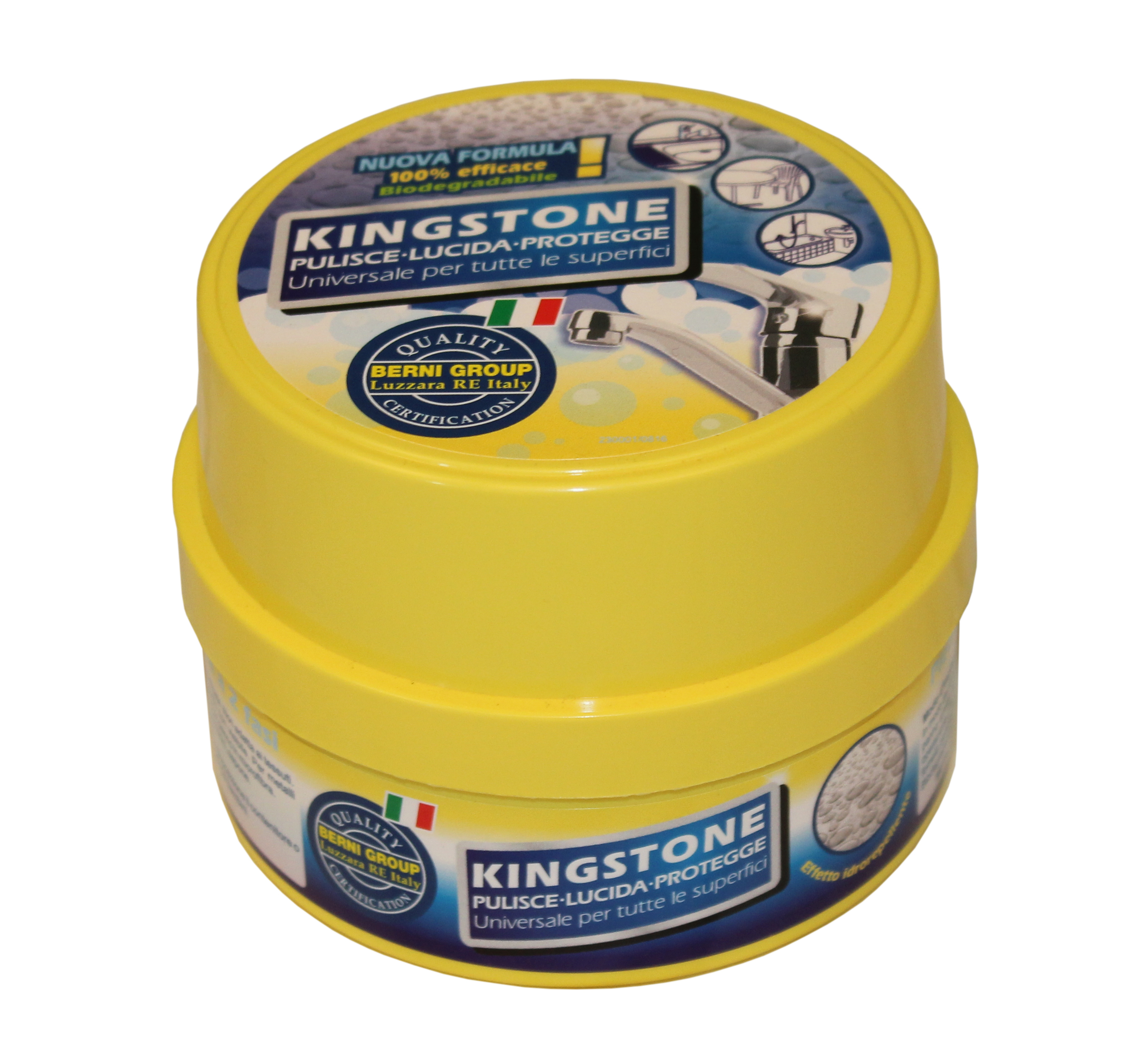 Kingstone universale permette di pulire delicatamente senza abrasione ogni superficie, fornelli, lavandini, box doccia, acciaio, plastica, legno, ceramica, metalli preziosi ecc., escluso il peltro.