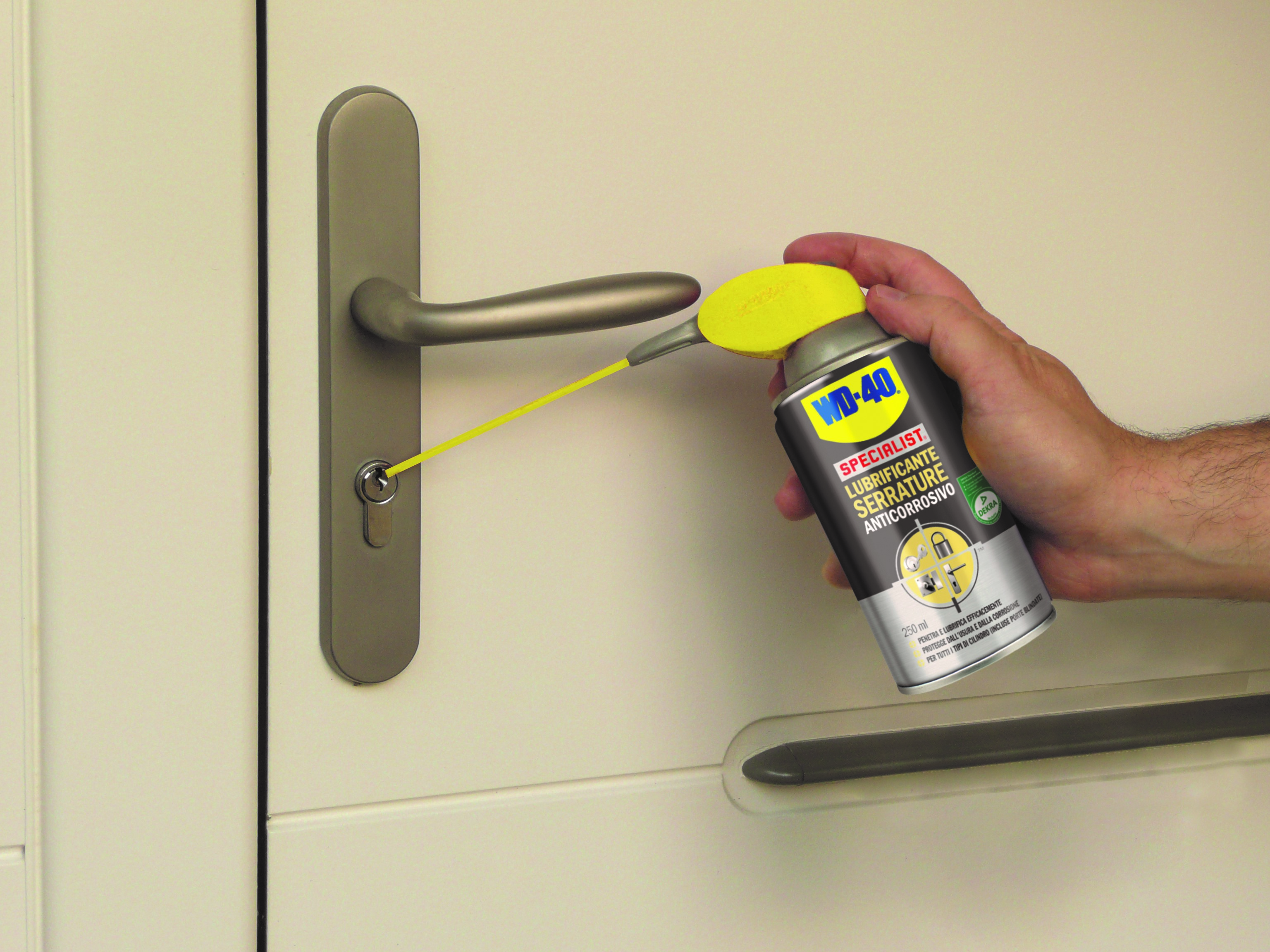 WD-40 presenta il nuovo Lubrificante Serrature Anticorrosivo della Linea Specialist. Disponibile nel formato da 250 ml, è stato sviluppato per la cura e manutenzione di ogni tipo di cilindro (incluse porte blindate). In particolare, è raccomandato per i meccanismi delle porte, cilindri, cerniere e pistoncini, per maniglie e perni dei deviatori, ma anche per serrature di case, mobili, veicoli, lucchetti, casseforti e bagagliai.