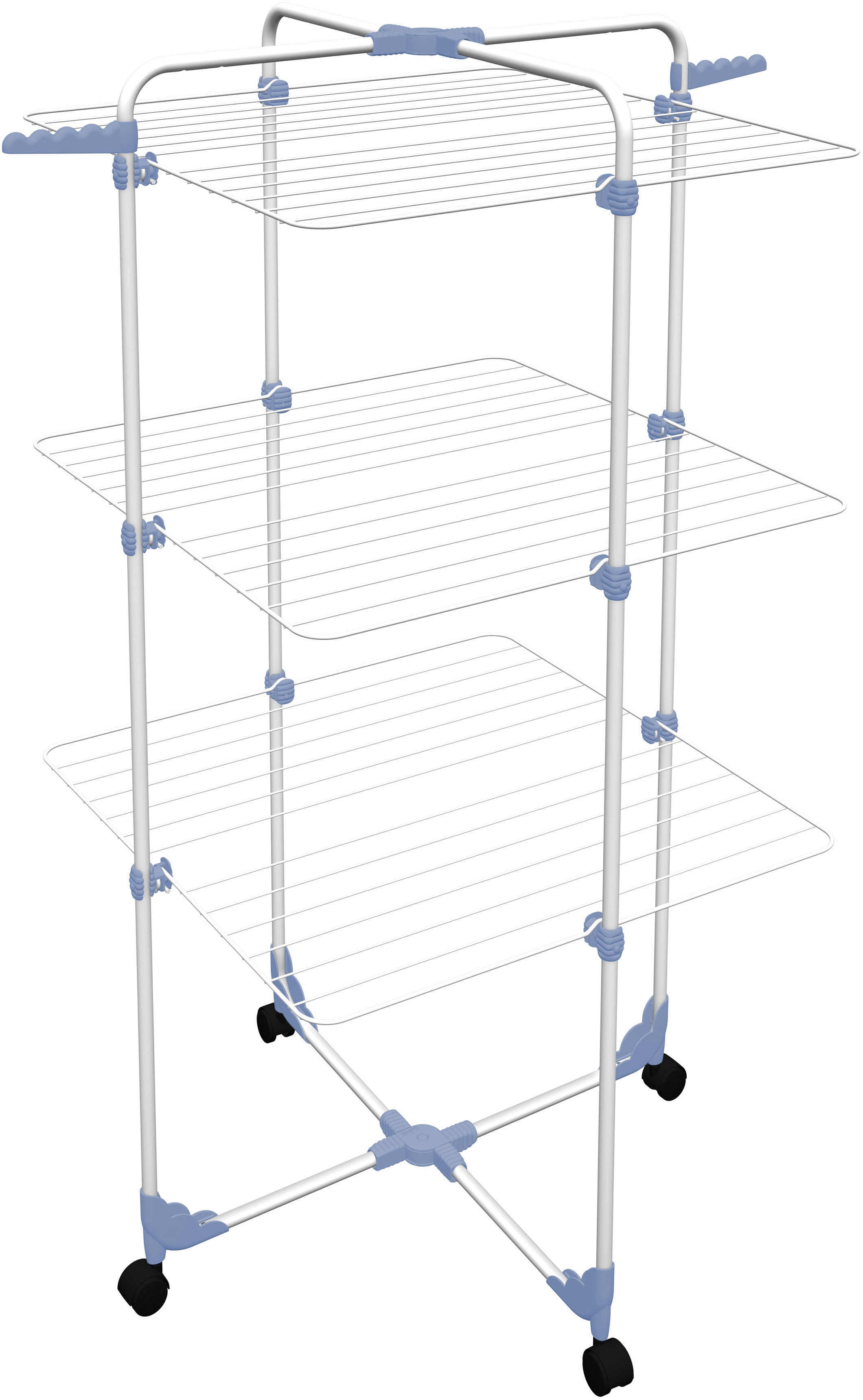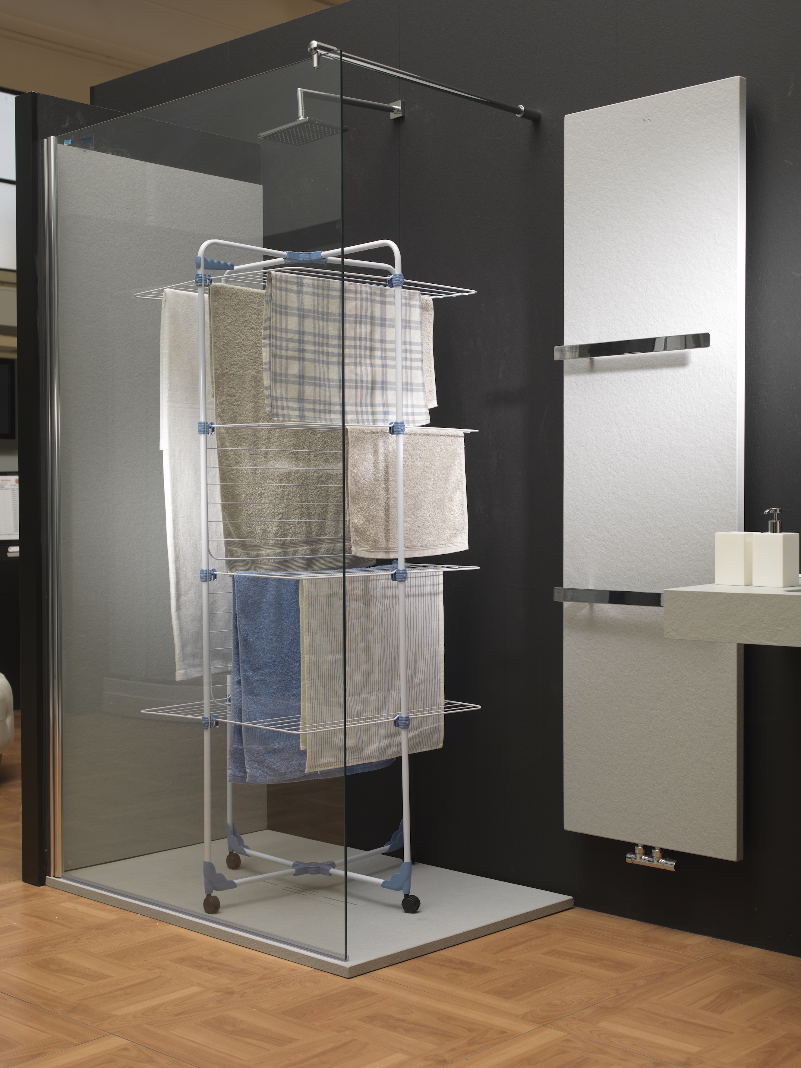 Modular è lo stendibiancheria verticale di Gimi dotato di uno snodo speciale che permette di aprire le griglie totalmente oppure a metà, in funzione del bucato. Lo sviluppo in verticale con 3 oppure 4 ripiani ripiegabili garantisce rispettivamente 30 o 40 metri di spazio di stenditura e permette a Modular di essere posizionato anche nel box doccia. Una volta chiuso, Modular occupa pochissimo spazio e da aperto, grazie alle pratiche 4 ruote piroettanti, può essere facilmente spostato anche carico.