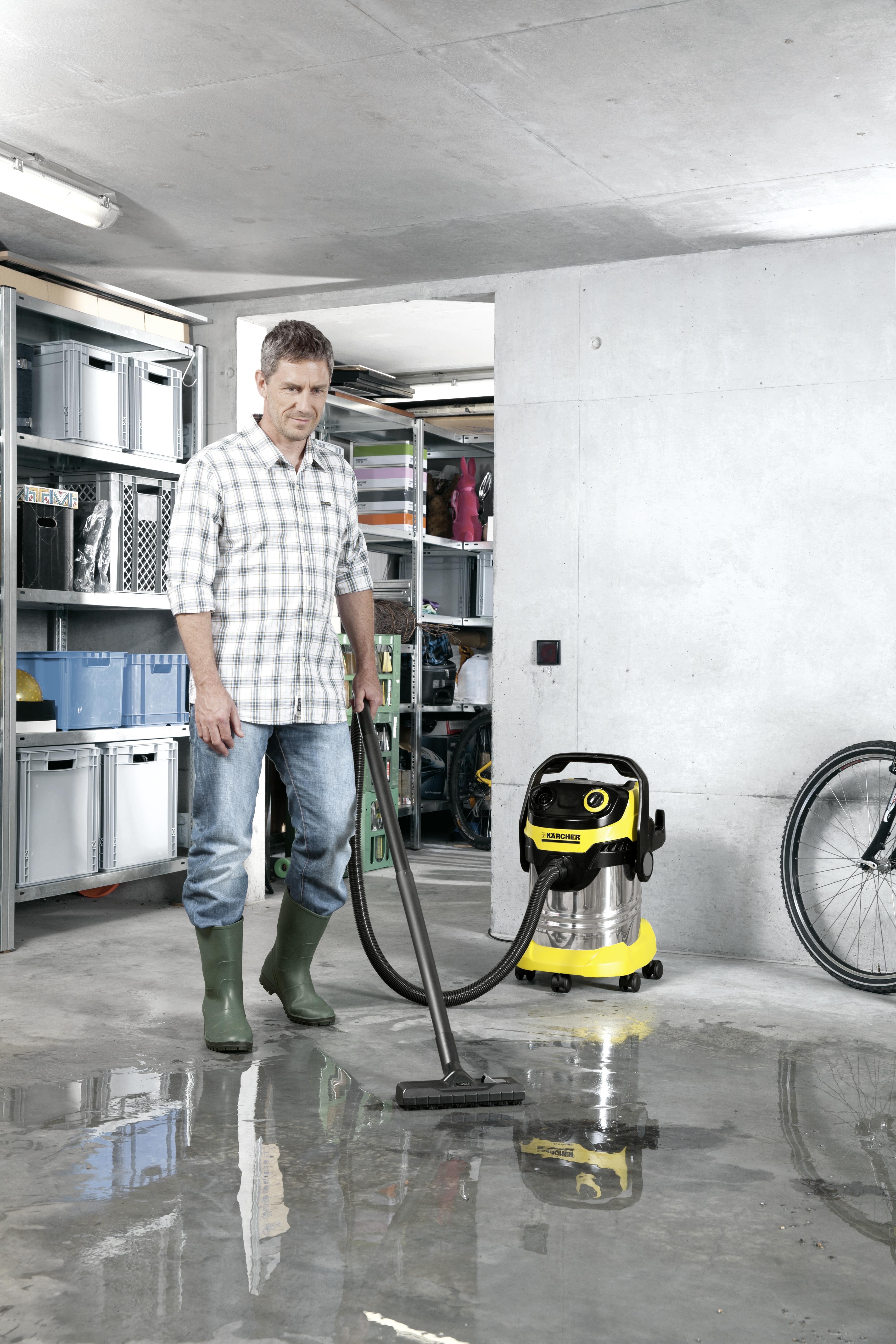 Un'altra caratteristica unica è la pulizia del filtro: forti impulsi di aria liberano il filtro, assicurando che le prestazioni di aspirazione siano rapidamente ripristinate. Kärcher WD 5 P Premium è fornito con gli altri strumenti utili, come per esempio la maniglia rimovibile, posizione di parcheggio per il tubo di aspirazione e l'ugello pavimento.