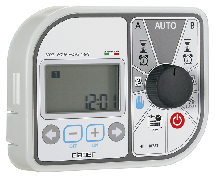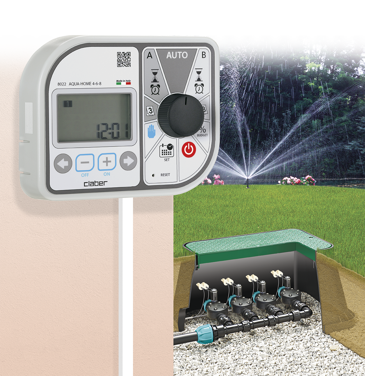 Massima facilità d’uso e affidabilità per Aqua-Home 4-6-8, il nuovo programmatore elettronico studiato da Claber per gestire l’irrigazione interrata del prato e delle aiuole. Compatto ed elegante nel design, semplice da installare, funziona con un trasformatore da 230 VAC incluso e consente di impostare un’irrigazione personalizzata da 1 a 8 linee, con due cicli indipendenti e fino a 4 partenze giornaliere per ciascun ciclo. La programmazione è semplicissima grazie a un selettore a manopola, quattro tasti e un grande display a cristalli liquidi. Novità assoluta anche il suo condensatore “Super Cap” che accumula energia durante il normale utilizzo e la rilascia in caso di black-out elettrico, consentendo un’autonomia molto superiore alle normali batterie tampone.