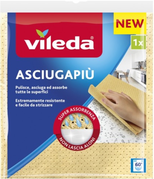 FHP presentaViledaAsciugapiù 1 pz, il nuovo panno multiuso dalle elevate prestazioni pulenti, ideale per rendere brillanti tutte le superfici della casa. Il rivestimento 100% in alcol polivilinico, simil pelle scamosciata sintetica, è particolarmente durevole e resistente ed è in grado di garantire straordinarie prestazioni pulenti e di asciugare rapidamente tutte le superfici della casa.