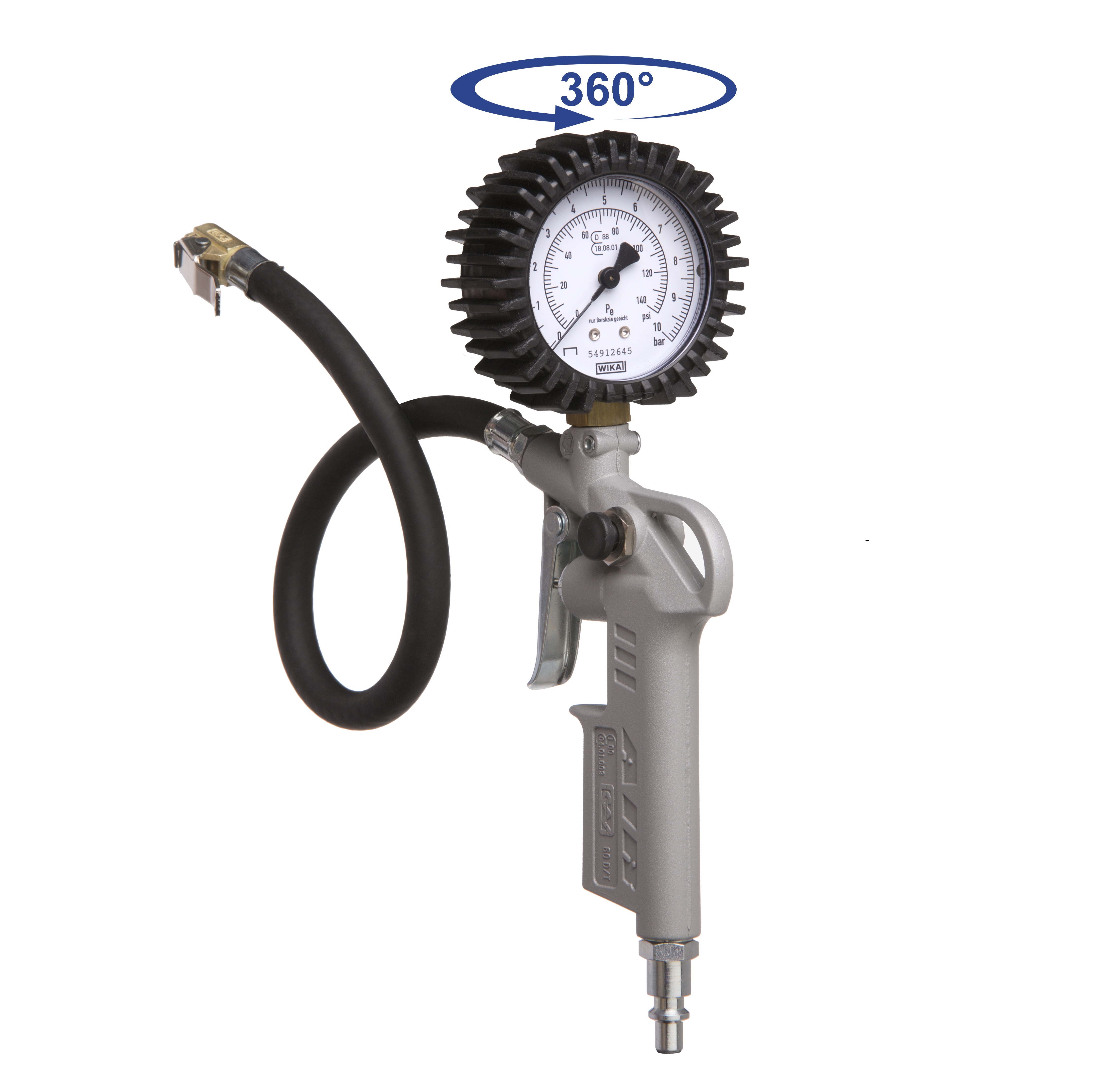 La pistola di gonfiaggio in alluminio modello 60D, essenziale in ogni gamma di accessori per compressori, viene proposta con il nuovo manometro girevole a 360°, per offrire la possibilità di lettura facilitata in ogni luogo e per qualsiasi tipo di impugnatura. Maggior resistenza agli urti grazie alla posizione del manometro non avvitato al corpo della pistola.