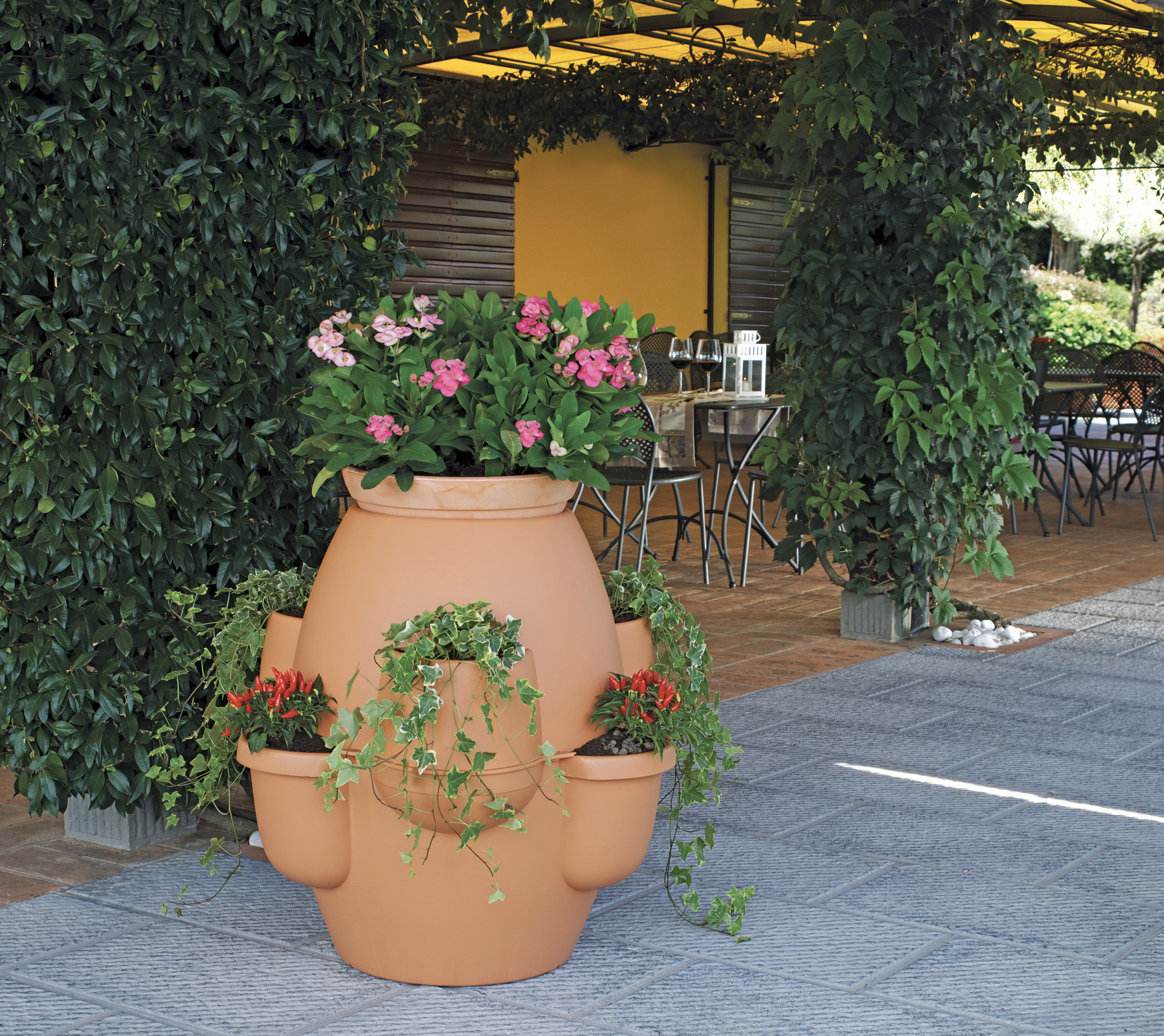 Ideale per la rosa arbustiva o rampicante con geranei francesini o edera nelle sei tasche, o per la pianta di limone contornata da roselline o piante ricadenti. Fornito non assemblato in imballo singolo. Ideale per ogni tipo di ambiente e disponibile in tre varianti colore: terracotta, ghiaccio e cappuccino.