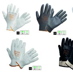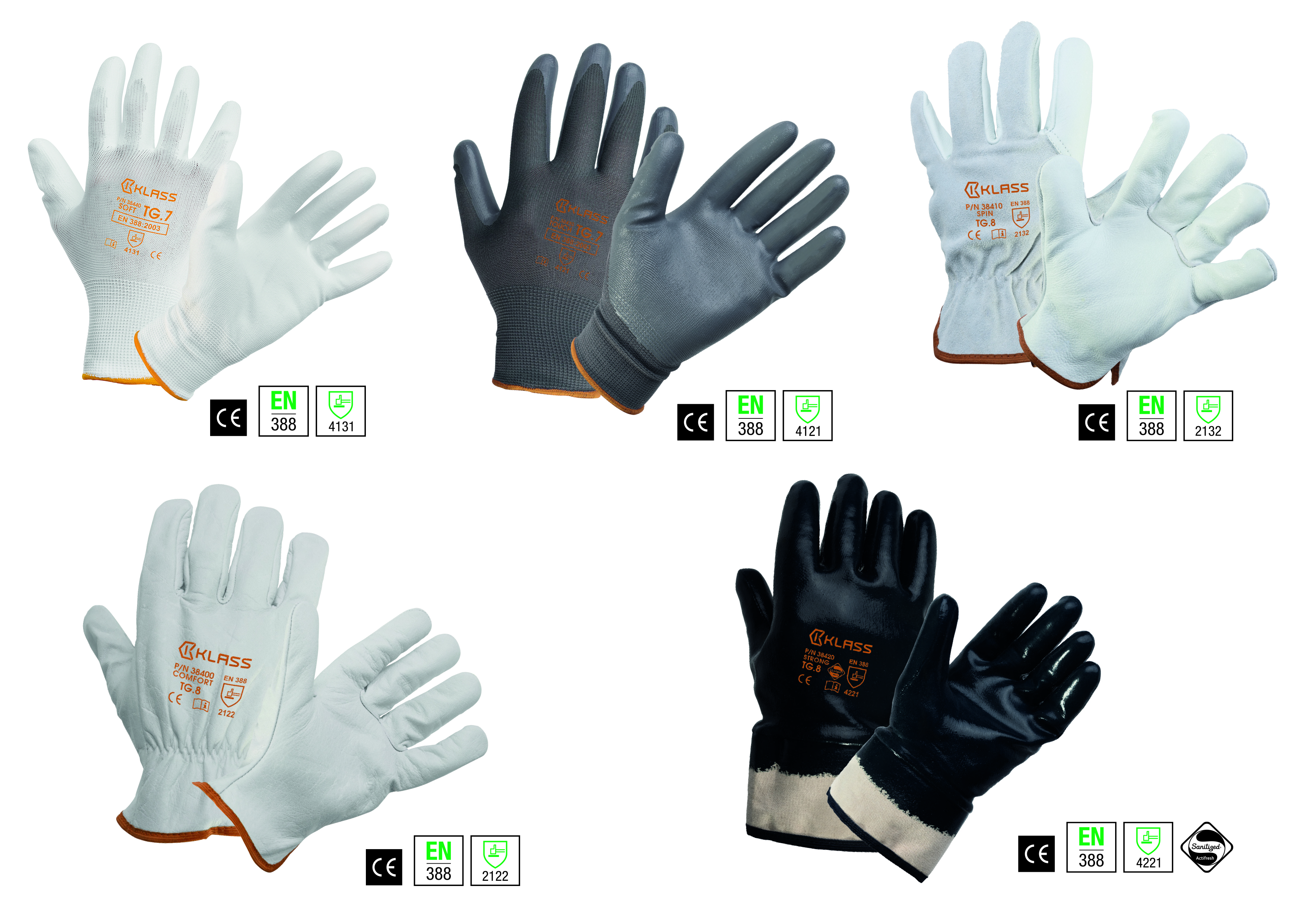 Ferval con il marchio Klass presenta diverse gamme di guanti. Comfort (Serie cod. 3840): sono certificati EN388(2122) interamente realizzati in pelle fiore bovino colore bianco con stringipolso elastico interno. Spin (Serie cod. 3841): sono certificati EN388(2132) hanno il palmo in pelle fiore bovino e dorso in crosta con stringipolso elastico. Strong (Serie cod.3842): sono certificati EN388(4221) realizzati in maglia di cotone interamente rivestito in nitrile con manichetta di sicurezza. Touch (Serie cod.3843): sono certificati EN388(4121) in filo continuo 13 gauge, rivestito in nitrile a trama liscia e resistenti agli agenti chimici. Soft (Serie cod.3844): sono certificati EN388(4131) in filo continuo 13 gauge, rivestito in poliuretano. La spalmatura in poliuretano consente di mantenere eccellenti resistenze all’abrasione senza rinunciare alla sensibilità delle dita.