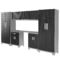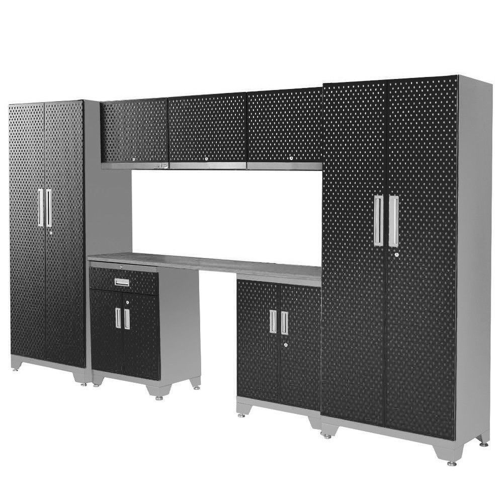 Ideale per tenere attrezzi e ricambi in perfetto ordine, la parete si compone di due armadi a due ante (dimensioni L76,2xP45,7xH183cm e peso di 39 kg), due mobili bassi con due ante di cui uno con cassetto (dimensioni L61xP40,6xH76,2cm, uno da 17,7 kg e l’altro da 21,8 kg), tre pensili con anta basculante (dimensioni L61xP30xH45,7cm e peso 8,2 kg) e un ripiano da lavoro in legno (dimensioni L183xP43,7xH2,5cm e peso 11,8 kg). Tutti i moduli sono dotati di serratura per tenere al sicuro il contenuto.