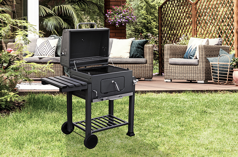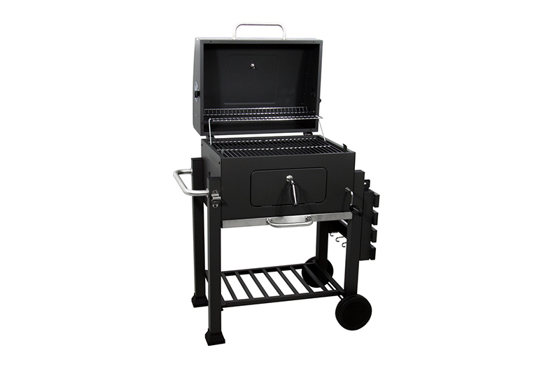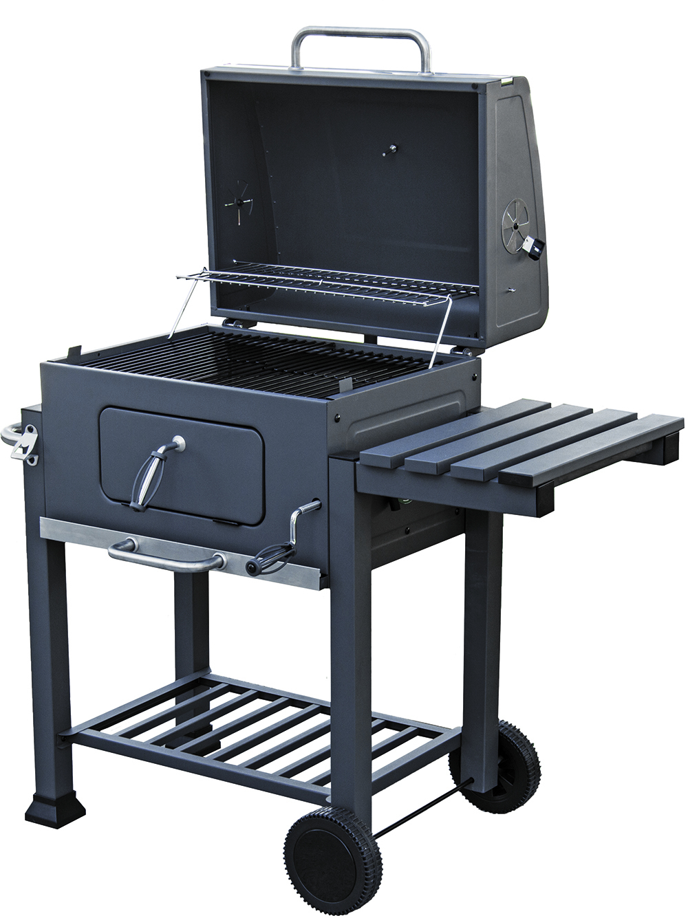 Il barbecue Arizona Evergreen di Sibrandè dotato di una doppia griglia di cottura in acciaio (56×40 cm) che garantisce una superficie estesa per grigliare qualsiasi tipo di cibo e di una comoda griglia superiore (54×25 cm). Il pratico vassoio carbone con altezza regolabile a manovella consente di mantenere un’intensità di cottura variabile. Grazie ai 4 sfiati laterali richiudibili è possibile regolare l’areazione e la combustione della brace, mentre il coperchio richiudibile favorisce la cottura e il mantenimento della temperatura. Arizona è inoltre dotato di raccoglitore cenere estraibile, indicatore di temperatura analogico, apribottiglie incorporato, ripiano laterale pieghevole con ganci porta utensili e base inferiore portaoggetti. La struttura è stabile e maneggevole, grazie al maniglione e alle due ruote alla base che ne agevolano lo spostamento. Larghezza con ripiano aperto 113 cm (chiuso 89 cm), altezza con coperchio aperto 140 cm (chiuso 110 cm), profondità 46 cm.