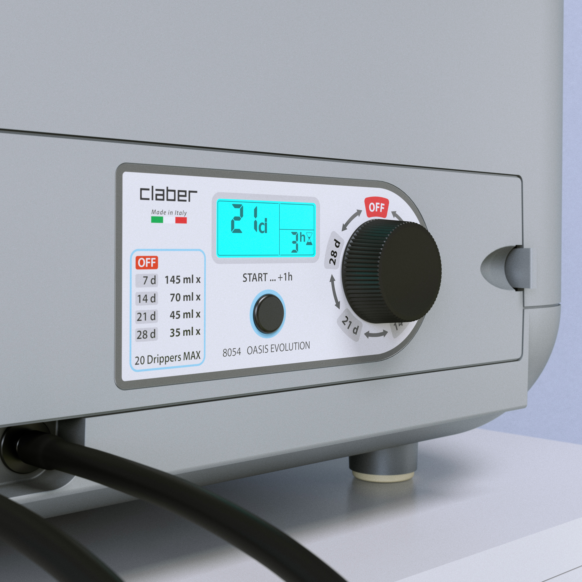 Oasis Evolution è la nuova versione del famosissimo distributore d'acqua Claberpr bagnare le piante di casa senza collegamento alla rete elettrica o al rubinetto. La novità più importante della versione Evolution risiede nel pannello di controllo, ora dotato di pratico schermo LCD retroilluminato per una perfetta leggibilità in ogni condizione. La programmazione, semplicissima, avviene sempre ruotando il comodo selettore a manopola per scegliere il programma preferito tra le 4 opzioni disponibili (nuovi programmi per un’autonomia di 7, 14, 21 o 28 giorni). La partenza dell’irrigazione può essere immediata oppure ritardata fino a 23 ore. Pronto in pochi minuti, ha una capienza di 25 litri d’acqua, funziona con due pile AA stilo ed è fornito completo di tutto l’occorrente per creare un circuito di irrigazione completamente autonomo fino a 20 vasi. Oasis Evolution è altrettanto rapido da smontare dopo l’uso e si distingue per il suo design moderno, in sintonia con l’arredamento della casa o dell’ufficio.