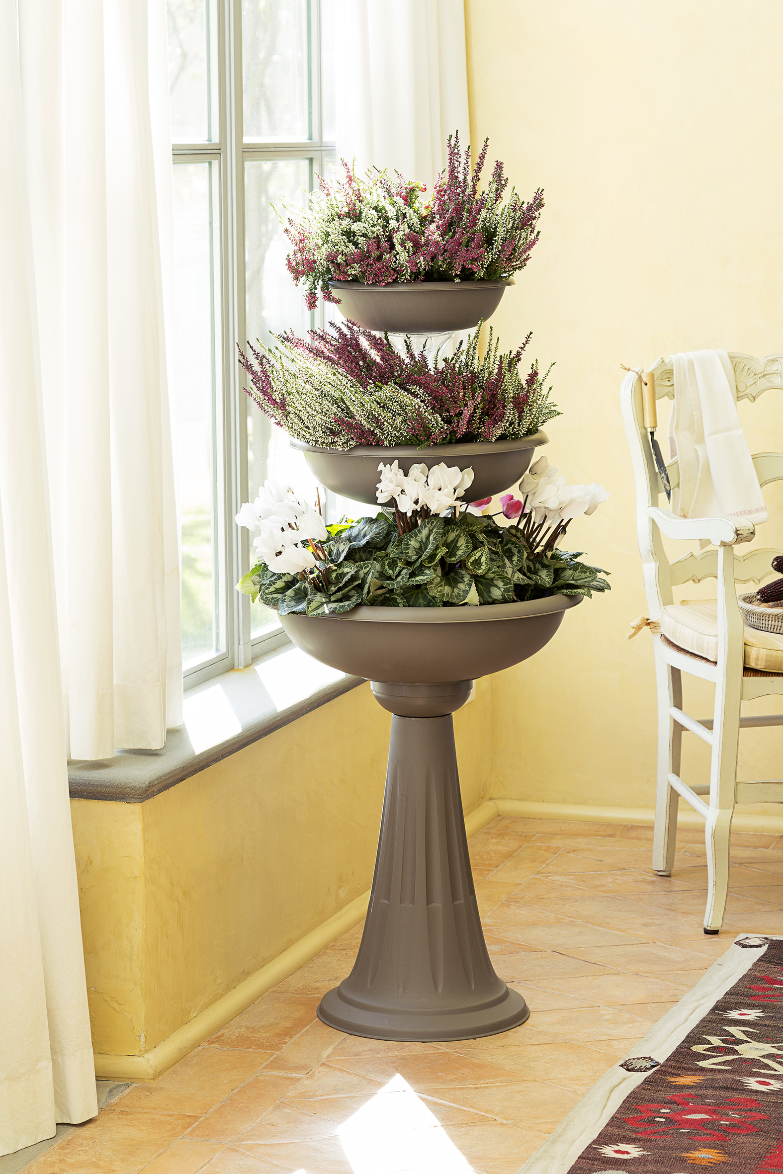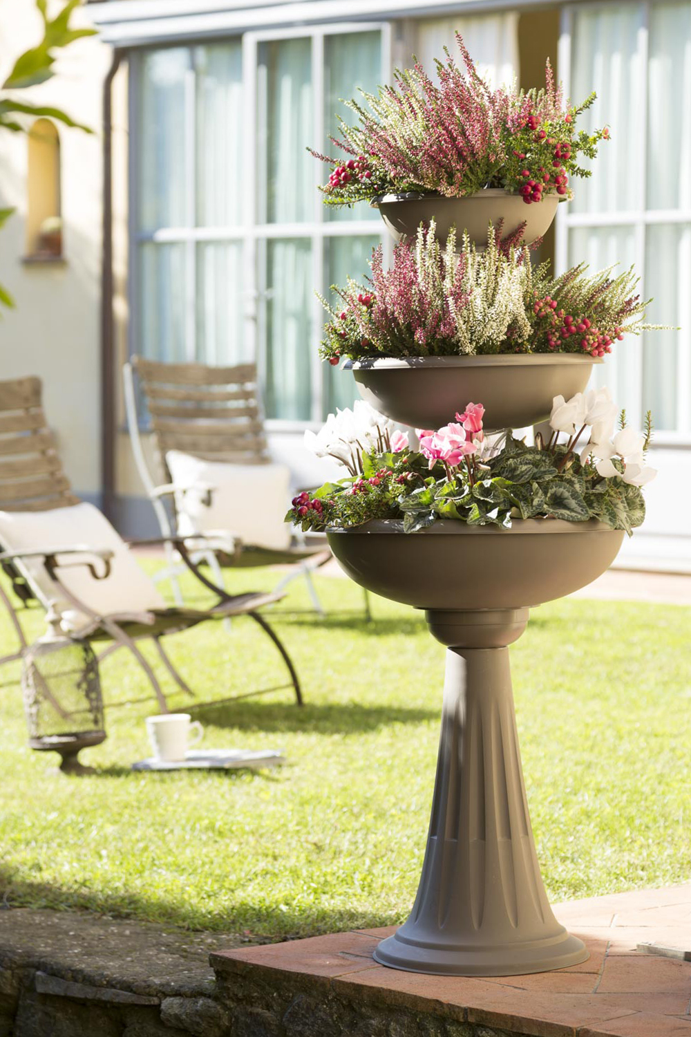Bama ha scelto un nome non casuale per questa fioriera: Trevy. Essa infatti è composta da tre ciotole rispettivamente del diametro di 30, 40, 50 cm unite da un kit di supporti trasparenti che ricordano il passaggio dell’acqua e la composizione ha l’aspetto di una fontana che zampilla. Inoltre, grazie alla base che la rialza da terra, la composizione risulta di grande impatto e lascia tutti a bocca aperta, proprio come la celebre fontana romana. L’acqua, però, non è comunicante tra una ciotola e l’altra e ogni ciotola va annaffiata separatamente.
