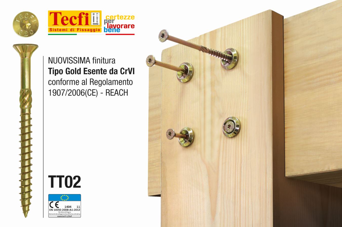 In ottemperanza alla normativa vigente da settembre 2017, l’azienda ha variato la zincatura con passivazione gialla. Il risultato è stato la nuova finitura “Tipo GOLD – Esente da CrVI”, un giallo brillante intenso che è riuscito a centrare molteplici obiettivi, tra cui mantenere e migliorare il risultato estetico, la capacità di protezione del rivestimento (e quindi, la durabilità dei sistemi di fissaggio), la salute e la sicurezza.